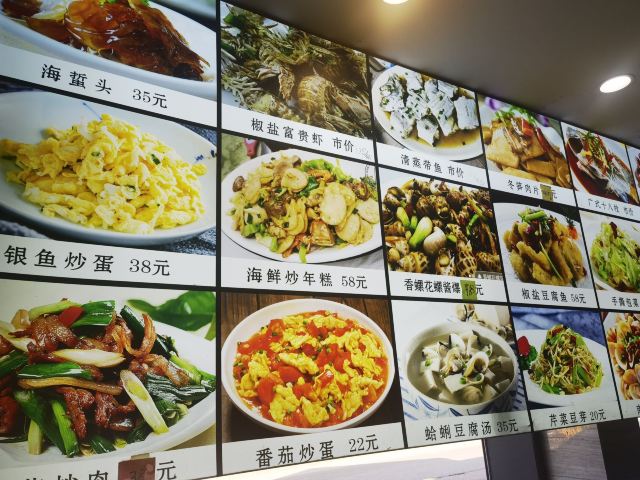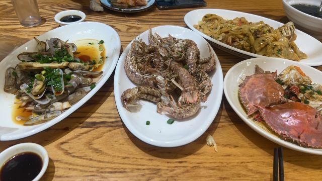 葱油海瓜子,清蒸石斑,葱油梭子蟹,酱爆鱿鱼,海鲜炒年糕,椒盐豆腐鱼,蒜蓉粉丝大龙虾,葱油蛏子,皮皮虾,红烧舟山带鱼,海蜇皮,虎头鱼豆腐汤,梭子蟹,螃蟹,毛蚶,酱爆海螺,海瓜子,清蒸带鱼,椒盐海虾,长毛虾,椒盐跳跳鱼,石斑鱼