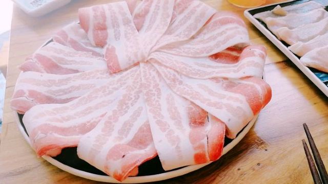 鹿儿岛黑豚五花肉,黑豚梅花肉,日式炸鸡,蘸料,杏仁豆腐,和风蔬菜沙拉,三文鱼,黑豚茶泡饭,菌菇蔬菜墨鱼鱼丸拼盘,烤鳗鱼