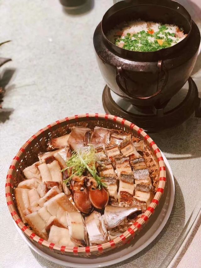 桂花糕,庙宇茄子,舟山传统三鲜,海鲜炒粉干,海鲜毛血旺,莲洋午渡,菩提之香,海鲜面,姜葱炒蛏子,红烧杂鱼,椒盐虾蛄,水果切盒,葱油海瓜子,竹荪罗汉斋