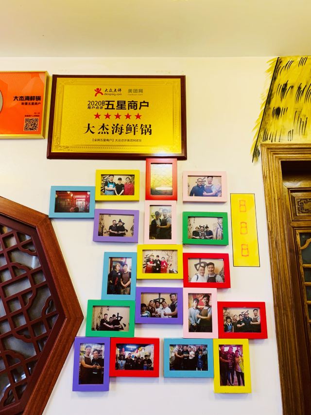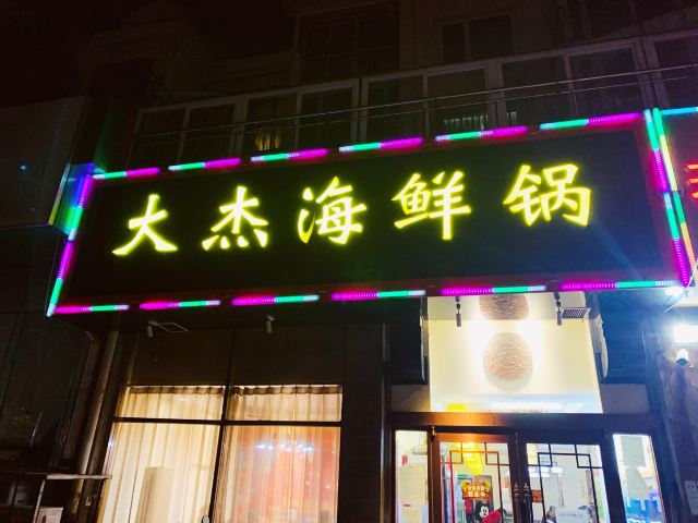 一休哥3在网上搜青岛有什么好吃的,搜到这家是青岛鱼鲜好评榜第1名,立马来了兴趣,打电话问了下店家说客人不多,于是就迅速打车奔向这里。店面不大,从外边看也不算起眼,进来后一眼就瞥见了墙上的照片墙,有很多名人和老板的合影,看起来有不少明星都来这里品尝过美食,正所谓“店”不可貌相。老板是个健壮的大哥,没猜错的话“大杰”就应该是他的名字,看到我们两个人来就很热情的招呼着,我们人少,因此就没有选择锅底,直接点了399的最大的海鲜锅大杂烩和2碟凉菜,后来证明没选锅底很明智,因为大海鲜锅我俩就吃不动了,种类丰富,量很足,海蛎子、梭子蟹、鱿鱼、虾爬子、鲍鱼、章鱼、螃蟹、生蚝等等,建议2个人来的朋友选299的就可以,399的锅3个人吃都没问题。 最先端上来入锅的是生蚝和螃蟹,生蚝很快就熟,老板捡出来后,把其余的海鲜一股脑全倒锅里,盖上盖开启蒸锅模式。之后老板并没有走,也不顾烫手,直接用小刀帮我们把生蚝肉挖出来,放在我俩各自的调料碗里,嘱咐我们趁热吃,后来还帮我们把蒸好的螃蟹、皮皮虾、鱿鱼等都处理好,一站式服务,省了我们很多事儿,服务很是周到。另外这家的凉菜和汽水也很不错,有一款大窑汽水在别的地方没喝过,有很多种口味,我们都点了个遍品尝了一番,很好喝,推荐大家尝尝。 吃完本来我们要打车回去,但是实在太美味吃得太饱,愣是溜达了半小时有点消化才打车回酒店,下次有机会来青岛,多叫点儿人再来开胃。