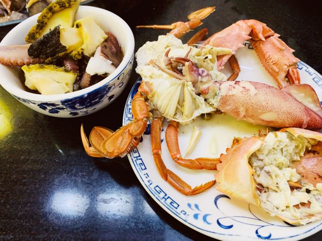 海蛎子,秘制蟹钳,铁锅炖棒骨,鲍鱼,铁锅蒸海鲜,鲅鱼饺子,椒盐虾虎,老板拨生蚝,钉螺,扇贝,梭子蟹,青岛原浆,炸五花肉,红螺,棒骨汤,野生杂鱼,糊玉米饼子,海鲜锅,白菜,鲅鱼锅底