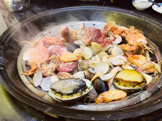 Da jie hai xian guo在网上搜青岛有什么好吃的,搜到这家是青岛鱼鲜好评榜第1名,立马来了兴趣,打电话问了下店家说客人不多,于是就迅速打车奔向这里。店面不大,从外边看也不算起眼,进来后一眼就瞥见了墙上的照片墙,有很多名人和老板的合影,看起来有不少明星都来这里品尝过美食,正所谓“店”不可貌相。老板是个健壮的大哥,没猜错的话“大杰”就应该是他的名字,看到我们两个人来就很热情的招呼着,我们人少,因此就没有选择锅底,直接点了399的最大的海鲜锅大杂烩和2碟凉菜,后来证明没选锅底很明智,因为大海鲜锅我俩就吃不动了,种类丰富,量很足,海蛎子、梭子蟹、鱿鱼、虾爬子、鲍鱼、章鱼、螃蟹、生蚝等等,建议2个人来的朋友选299的就可以,399的锅3个人吃都没问题。 最先端上来入锅的是生蚝和螃蟹,生蚝很快就熟,老板捡出来后,把其余的海鲜一股脑全倒锅里,盖上盖开启蒸锅模式。之后老板并没有走,也不顾烫手,直接用小刀帮我们把生蚝肉挖出来,放在我俩各自的调料碗里,嘱咐我们趁热吃,后来还帮我们把蒸好的螃蟹、皮皮虾、鱿鱼等都处理好,一站式服务,省了我们很多事儿,服务很是周到。另外这家的凉菜和汽水也很不错,有一款大窑汽水在别的地方没喝过,有很多种口味,我们都点了个遍品尝了一番,很好喝,推荐大家尝尝。 吃完本来我们要打车回去,但是实在太美味吃得太饱,愣是溜达了半小时有点消化才打车回酒店,下次有机会来青岛,多叫点儿人再来开胃。