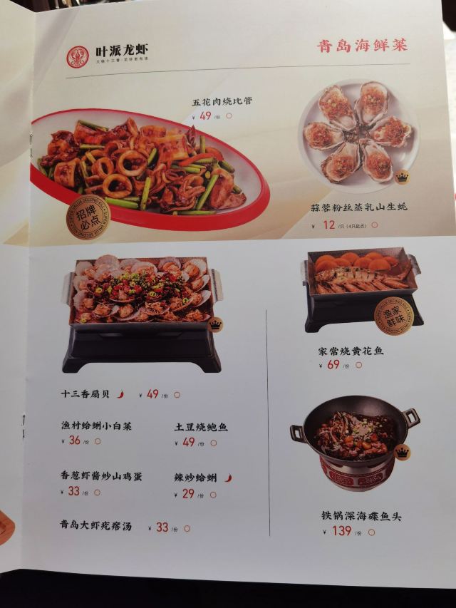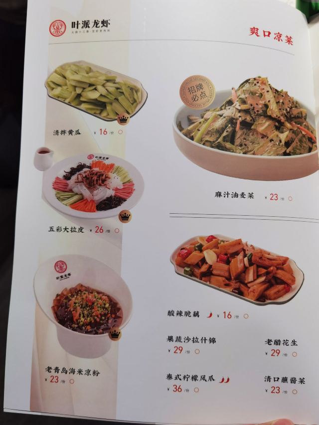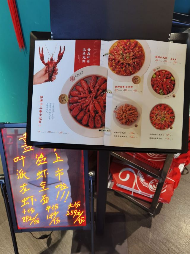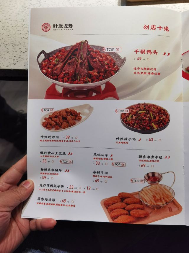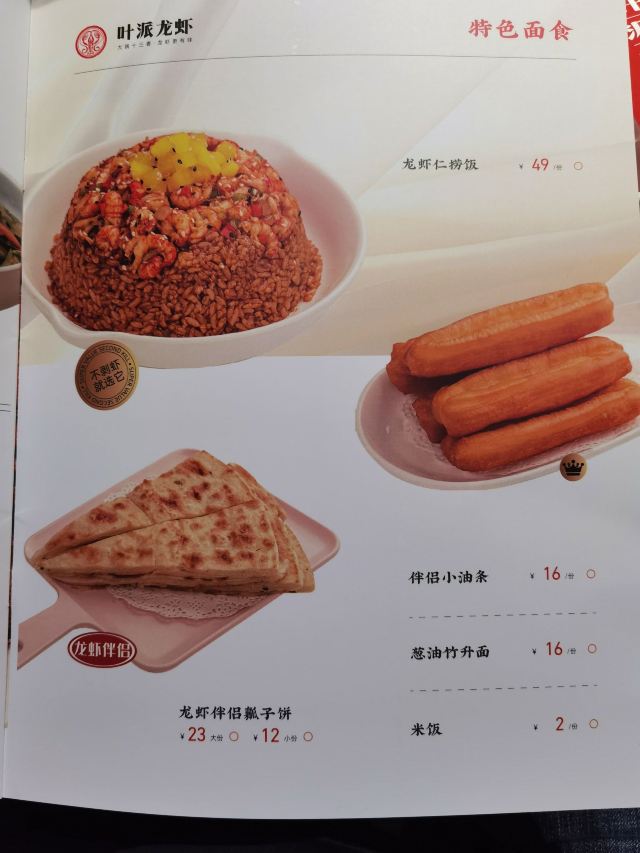 十三香小龙虾,蒜香鸡翅(配薯条),年糕香辣大闸蟹,干锅鸭头,龙虾仁捞饭,龙虾伴侣瓤子饼,叶派硬炸肉,龙虾伴侣小油条,蛋黄焗龙虾,麻辣小炒牛蛙