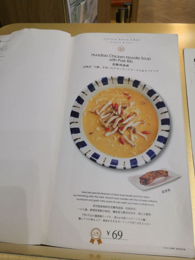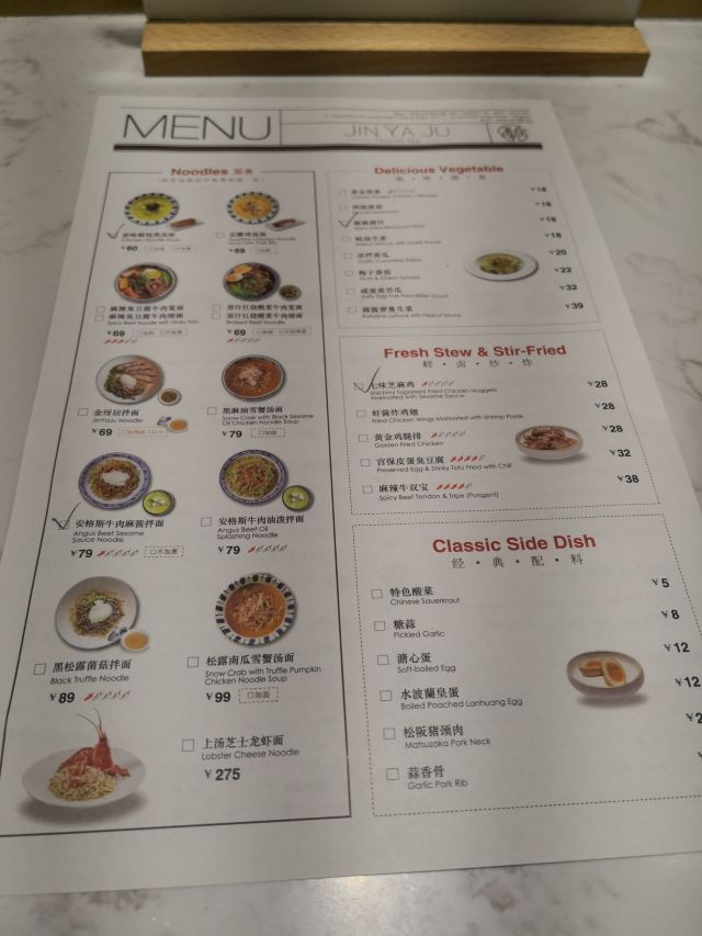 七味芝麻鸡,宫保皮蛋臭豆腐,麻辣臭豆腐牛肉面,松露南瓜雪蟹汤面,原味精炖鸡汤面,麻油雪蟹汤面,金玡居拌面,黑松露拌面,水煮三样,米其林鸡汤云吞,蒜香骨,花椒半筋半肉汤面,梅子番茄,巧克力慕斯,松阪猪颈肉,七味芝麻椒炸鸡,鲍鱼卤肉饭配鸡汤