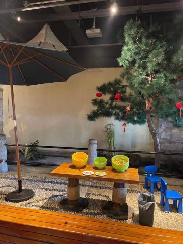 环境蛮有特色,装修得古色古香,各式各样的小摆设充满了农家的质朴。主打自然是粥,甜口的、咸口的、冷的、热的,应有尽有。