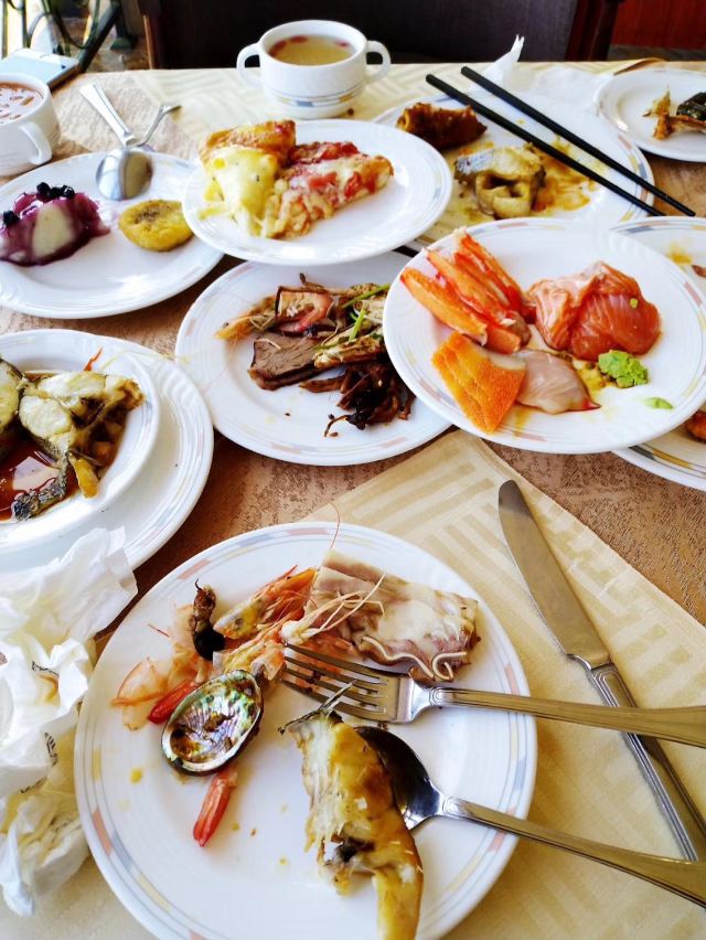 王朝烤鳗,肉沫海参,大虾烧白菜,鲅鱼馅饺子,小蛋糕,煎羊排,三文鱼,青岛大虾,冰淇淋,生鱼片,海鲜,煎牛排,鲍鱼