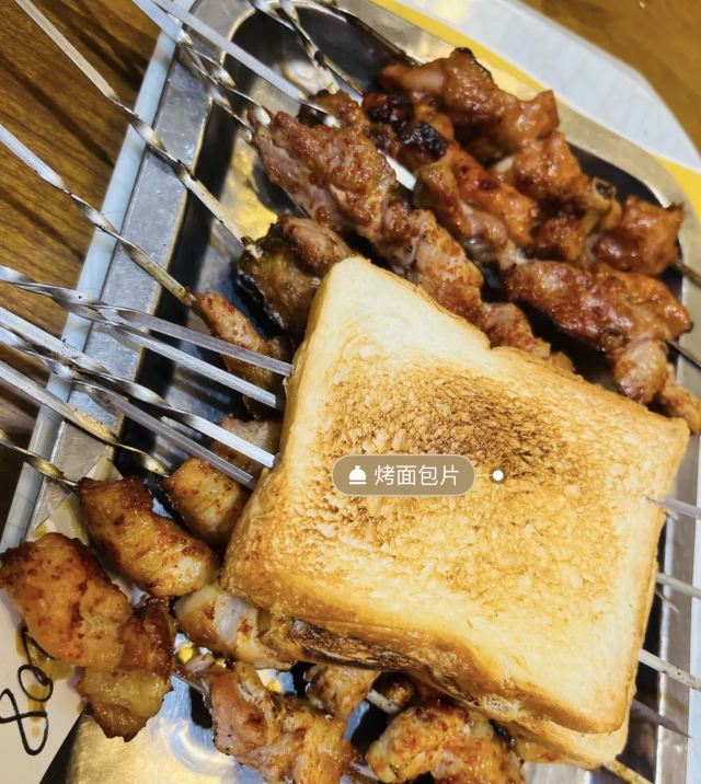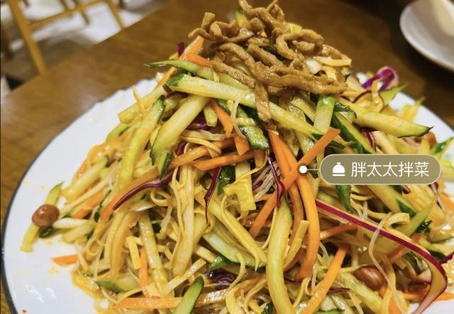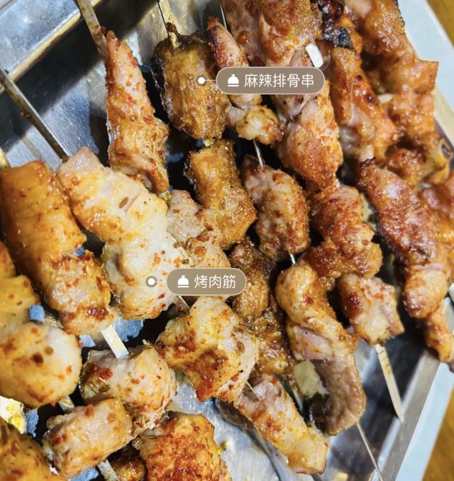 胖太太拌菜黄瓜、胡萝卜、粉丝、紫甘蓝、豆腐 皮拌到一起,口味偏甜,特别清口,量也很大,胡萝卜要是能焯水烫一下更好 蜜汁排骨串这个一定要点,偏甜口,排骨很嫩,轻轻一抿,骨肉分离,味道绝绝子 肉筋串肉筋对我来说有一点肥,但是小伙伴又感觉瘦肉有点柴,众口难调吧,但是肉很入味,也比较嫩
