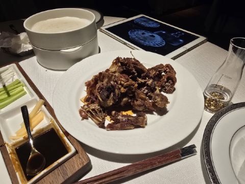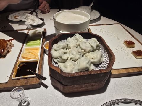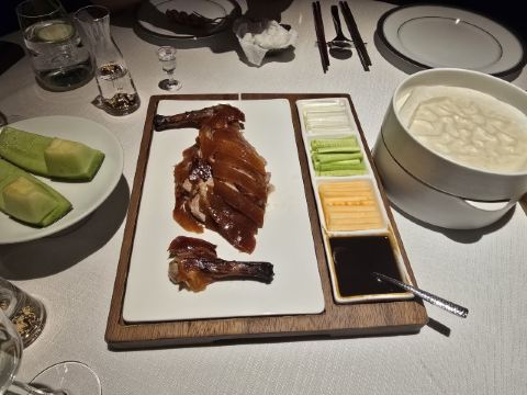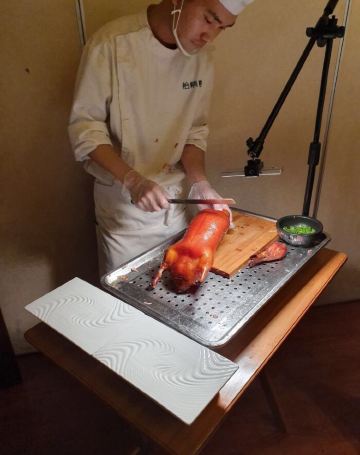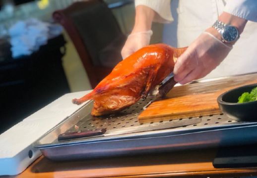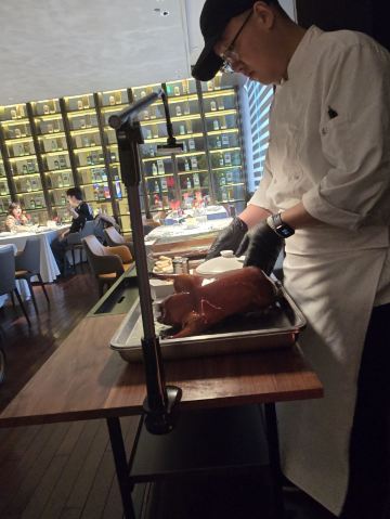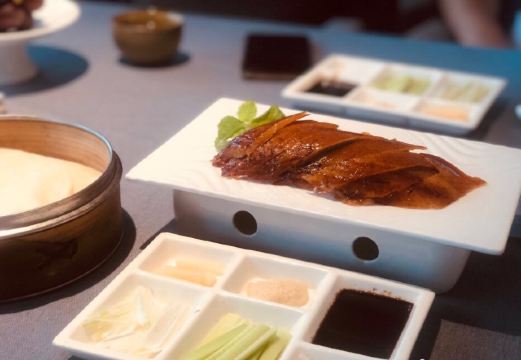 YoYo_9M8E2A2S恰情楼位于家乐福身后的徐州路一号中心假日酒店二、三层 有大厅也有包间包间在三楼数量不少 适合 美食 餐饮 商务 宴请 家庭聚会 地上、地下停车场记得要停车券 点了268的烤鸭包间里面师傅当面片的酱料 和葱丝黄瓜条是每人各一份不需要打架这点不错 烤鸭是特色现场改刀皮酥肉嫩 其他的菜也算可以油膩的清淡的都有 点了份果木烟熏牛肉也是上桌现场烟熏的肉质一般 五香薰鲳鱼没有点的黄花鱼 夏日一份清涼的凉粉很是舒服 这个季节的冰镇庄园没有青萝ト胡萝ト是 大胡萝ト条 白灼鲜蛎虾很新鲜 猪蹄味道不错糯米藕也可以鱼不怎么样龙虾焗伊面的面有点硬其他没什么印象了
