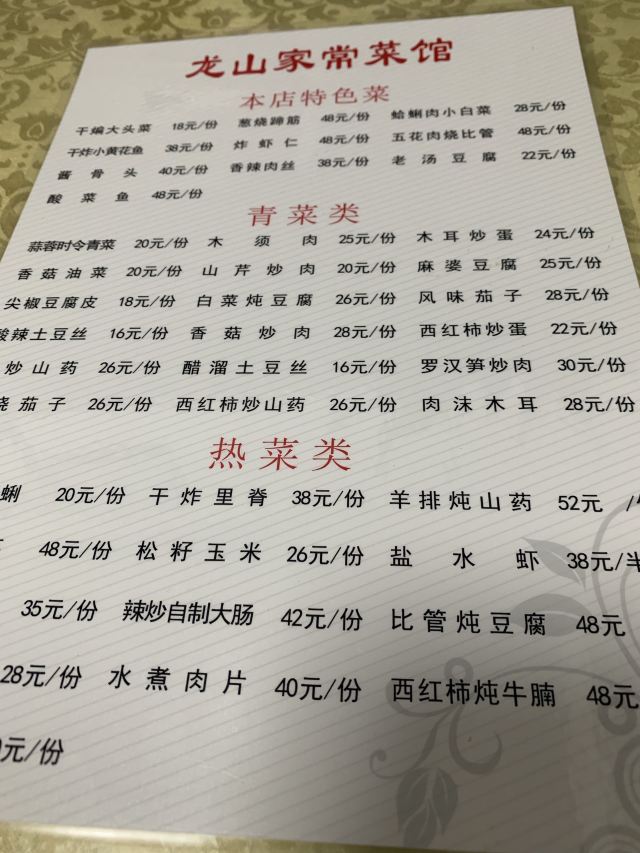 黄瓜伴猪耳,孜然金钱腰,鱼香茄子,松子玉米,老汤豆腐,炸小黄花鱼,干煸大头菜,葱烧蹄筋,香辣肉丝,五花肉烧比管,酱骨头,风味烧茄子,红烧茄子,鲜虾炒白菜