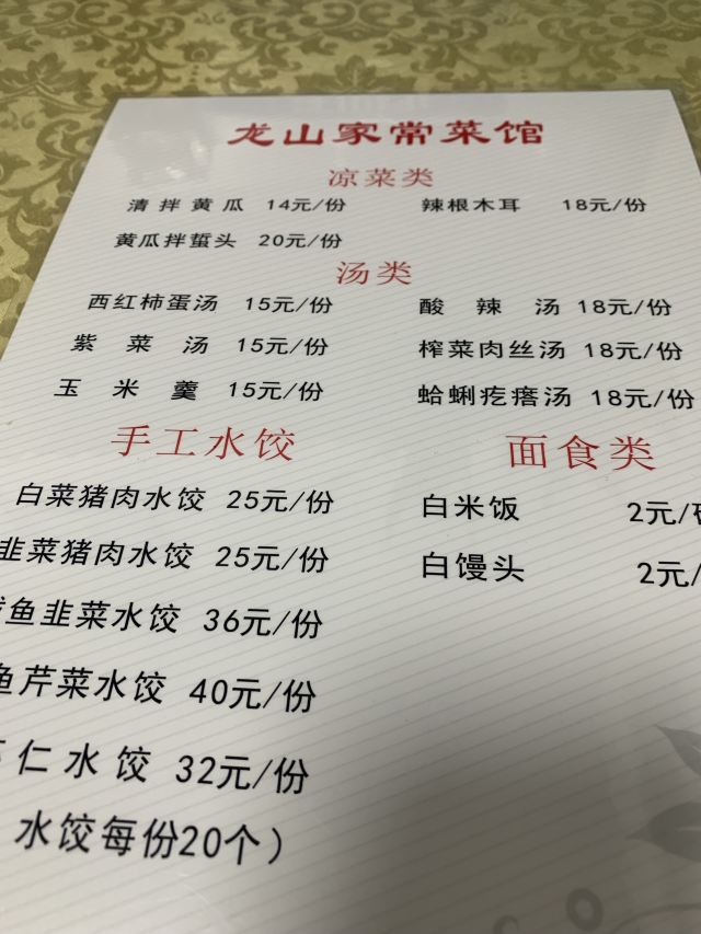赶到信号山公园的时候已经接近17:30了,匆匆忙忙上山转了一圈,下山寻找吃饭的地儿发现的这家小店。一个人来的不好点菜,要了一份鲅鱼韭菜水饺和墨鱼芹菜水饺双拼,38元20个。味道很行,就是不像现包的手工水饺,应该是提前包好冷冻的,可能是为了方便节约时间成本吧!可以理解,不过美食还是现场制作的最好吃,据说他家的炸小黄鱼、辣椒炒肉最好吃,大家可以试一试。店内只有四张小桌和一张圆桌,青岛老城区这种不起眼的小店很多,菜品的味道却很好,海边吃的就是新鲜的海鲜,店面的房租越老城区越贵。