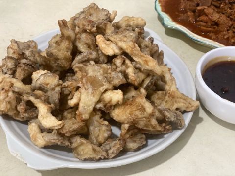 张嘴波浪线太爱这家的辣鸡心了 剖开放血都能如此软嫩 汤汁浇米饭 绝了 感觉这才是青岛第一 满口香第一 之前谁说的这家辣肉第一?纯瘦肉切片没挂浆直接炒的话 干硬柴很难避免 另外炸蘑菇也很棒 清爽不油腻 蘸料很特色 别家没有 辣炒大头菜如果是不切丝又放浓油赤酱的话 我肯定能光盘 酸辣汤上桌以后大叔提醒我搅搅上头的胡椒再盛出来 好喝 再酸点儿我更爱 12点来的 要了一个四人桌 刚坐下大叔大姐就让点菜 人没来齐菜就齐了 总共5分钟吧 深圳速度~不过能理解 店开了30多年一直都这样 饭点儿排队拼桌翻台店里都习惯了 服务节奏快是常态 这些年就算再涨价 依然还是便宜量大 菜单在墙上 不会点的直接从特色菜那栏开始就行 吃这顿“食堂饭”激起了大家的回忆杀 挺好
