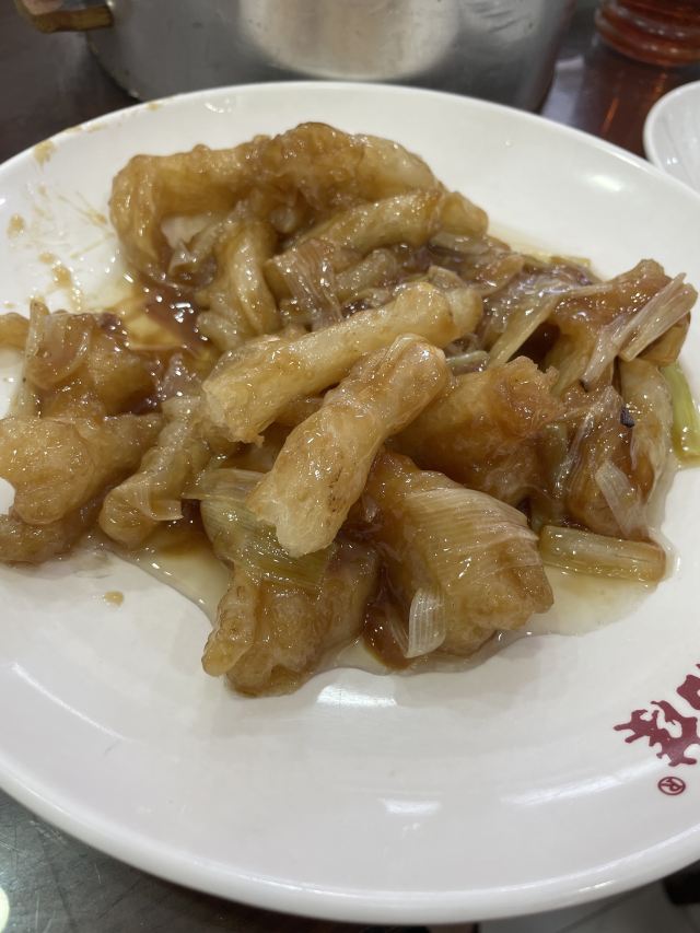 陌染MM去山东旅游,这一站来到了青岛。报了一部出租车带我们在市区到处逛逛,来到了老街这里,司机告诉我们,这一家餐厅是老字号的鲁菜馆,是全青岛历史最老的一家鲁菜馆。中午我们专门过来这里尝试了一下。 环境:餐厅的位置,从清朝年代就已经在这里了,只是现在扩展了,扩充了地方而已。一楼是收银台,二楼以上才是餐厅,没有特别大的大厅,只有容纳几张桌子的包厢。 [服务铃]服务:服务员不多,一位年纪偏老的服务员负责一个大包厢,我们那几桌都是他一个人在忙碌着。他动作迅速,很熟练的服务着各位客人。 「爆炒腰花」这里的招牌菜之一,腰花也就是猪腰花,有点臊味,但是炒得挺香的,味道偏浓,还放了木耳吸收一下酱汁。 「肥肠」提起鲁菜,大家肯定会想到九转大肠,我也是冲着它的名堂而点的菜。猪大肠非常肥美,嘴巴一咬就有肥油渗出来,尽管如此,多吃几块还是可以的,没有太腻的感觉。 「油爆活海螺」海螺不是特别多,看上去颜色差不多的是笋片,混在一起看上去很像海螺。打了浓浓的芡,吃起来有点稠稠的。味道还不错,感觉算是鲁菜里面最清淡的一道菜了。 「招牌饺子」个头很大,用料十足,饺子都是蒸出来的,没有煎饺,不会上火。酱料就是普通的饺子汁,不像我们广东的酱料,下醋又下蒜。