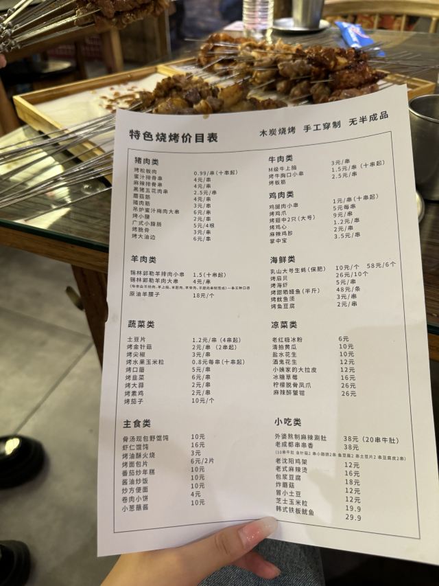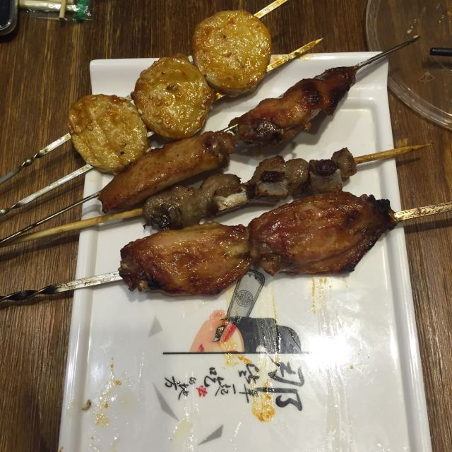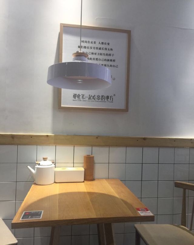 白色系和木质家具的装饰简约清新,墙上还印有一些手写体句子,很有文艺气息。烧烤种类丰富,蜜汁排骨串是店内的招牌之一,制作蜜汁的蜂蜜是山西的土蜂蜜,口感香甜不腻。