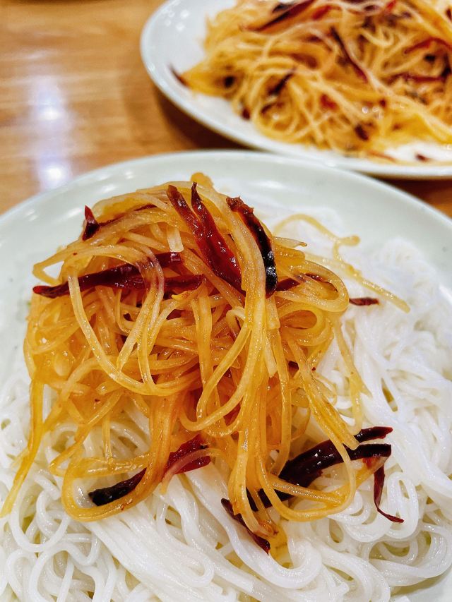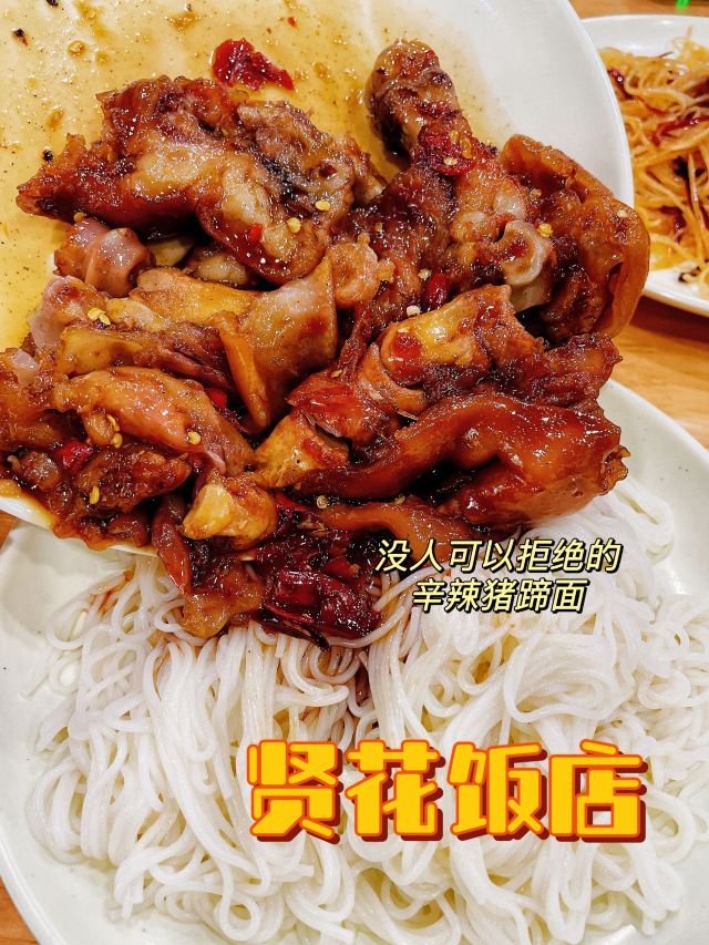 冰澈大人🐷下着大雨的工作日中午,我们抢到了贤花的最后一张桌子… 🐷我身边的朋友们吃过贤花猪蹄面的就没有说不好吃的!我个人也是爱到不行! 🐷猪蹄炖的很软烂,超级入味!一口下去满满的胶原蛋白,不用动手都可以轻松跟骨头分离开!我第一次来要的微辣给我辣的有些迷糊,这次的微微辣刚刚好~不能吃辣的人直接选无辣。 🐷直接把热乎乎的猪蹄子浇到面上。面是凉的,是那种很q弹筋道的面。拌匀后一口猪蹄一口面,每根面条都吸满了汤汁,特有滋味~ 🐷这家的土豆丝也很好吃,跟别家的味道不一样。切得很细的土豆丝跟切得很细的红辣椒一起爆炒,味道很特别!但是我也吃不出来加了什么料~ 🐷大酱汤不建议点,很稀,味道很一般。 贤花的价格这几年略有上浮,但是定价还是很合理的。猪蹄40r,面7r,土豆丝18r,俩人100r出头吃的很饱~出餐速度和翻台速度都很快,很适合周围工作的小伙伴改善一下工作餐伙食~ 指路:贤花饭店(城阳总店) 推荐指数:🌟🌟🌟🌟🌟