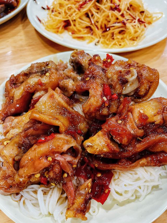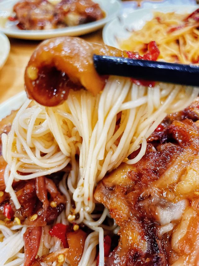 Xian Hua Fan Dian(chengyangdian)🐷下着大雨的工作日中午,我们抢到了贤花的最后一张桌子… 🐷我身边的朋友们吃过贤花猪蹄面的就没有说不好吃的!我个人也是爱到不行! 🐷猪蹄炖的很软烂,超级入味!一口下去满满的胶原蛋白,不用动手都可以轻松跟骨头分离开!我第一次来要的微辣给我辣的有些迷糊,这次的微微辣刚刚好~不能吃辣的人直接选无辣。 🐷直接把热乎乎的猪蹄子浇到面上。面是凉的,是那种很q弹筋道的面。拌匀后一口猪蹄一口面,每根面条都吸满了汤汁,特有滋味~ 🐷这家的土豆丝也很好吃,跟别家的味道不一样。切得很细的土豆丝跟切得很细的红辣椒一起爆炒,味道很特别!但是我也吃不出来加了什么料~ 🐷大酱汤不建议点,很稀,味道很一般。 贤花的价格这几年略有上浮,但是定价还是很合理的。猪蹄40r,面7r,土豆丝18r,俩人100r出头吃的很饱~出餐速度和翻台速度都很快,很适合周围工作的小伙伴改善一下工作餐伙食~ 指路:贤花饭店(城阳总店) 推荐指数:🌟🌟🌟🌟🌟