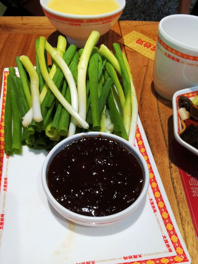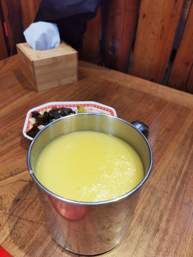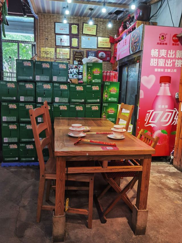 青青岛-一只鸡在山东是很难逃过悲惨的命运,各种吃法里面,炒鸡是山东人的最爱!大院炒鸡在青岛也有几年了,口碑和人气一直不错。中午2个人不知道吃啥,索性就来吃个鸡吧,口味不错而且离家也不远。绍兴路上的这家店相对比较好找,但是停车不是太方便,开车的朋友尽量早点来占位置。入座扫描点餐,这期间服务员先给你上了一瓷缸的棒子面粥来垫垫,一遍喝粥一边等菜。2个人点了个大份炒鸡,吃起来基本没有啥压力。山东人吃饭离不开葱姜蒜,顺便来了一份小葱蘸酱。刚出锅的松软的饼,吸收了炒鸡汤,别提多么美味了。店里分2部分,外面大厅基本都是马扎子比较多,上到上面半层的话有桌子,面积还是不小。