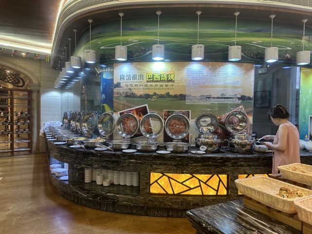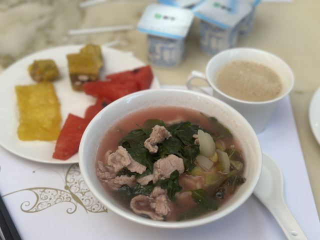 去梅州旅游,来到了客天下旅游景区,住房包早餐,是在一楼的西餐厅用餐,这里就是标准的团餐早餐,没有一点高水平的餐品,面包应该都不是自己做的,可能都是拿货回来的吧,除了基本的煮鸡蛋、现煮粉面、水果以外,感觉都是用半成品、预制菜加热,例如黄金糕,都已经被加热得硬硬的了。幸好还有酸奶。