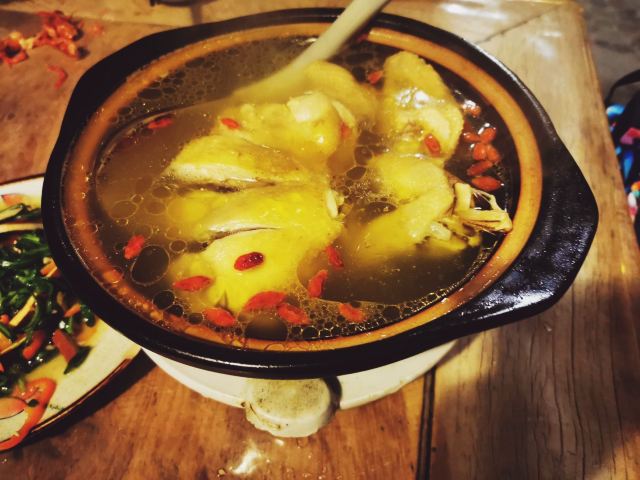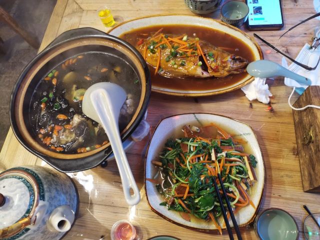宏村第一次来,阴天也美如画,在景区内逛了两圈拍拍拍了好多照片~天冷想吃热腾腾的本地菜,看推荐来了这家位于景区里面的居善堂,虽然位置比较靠内,里面别有洞天,有古代大户人家的气质。点了热气腾腾的土鸡煲和几道时蔬,土鸡汤上来是加热砂锅,慢慢喝汤不怕冷掉,鲜掉眉毛~听阿姨说是土鸡只加枸杞盐巴炖的,真的太鲜了,肉和汤全部干光。时蔬炒的也好吃。