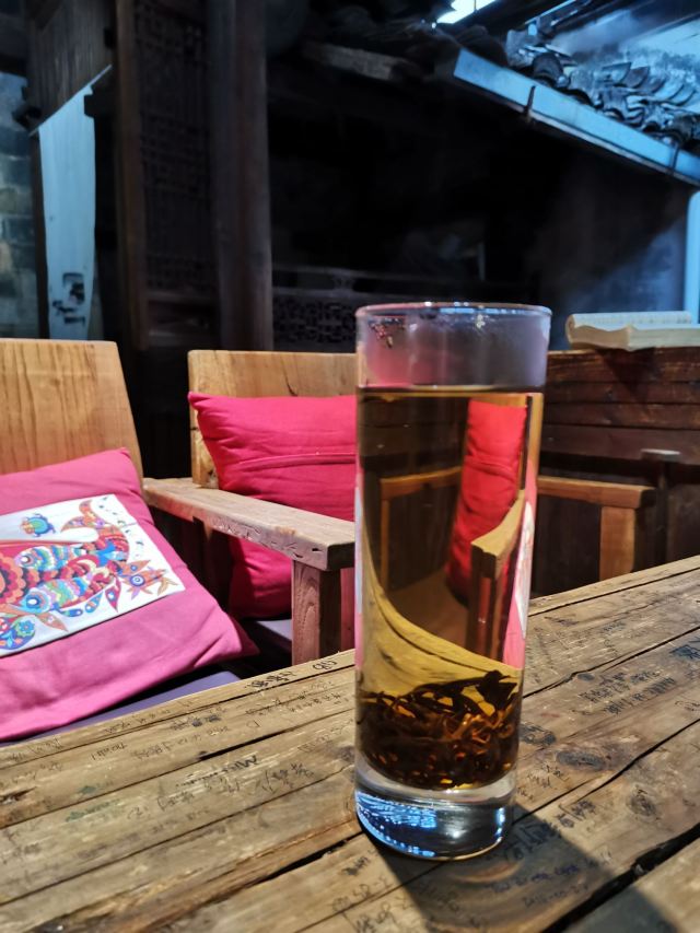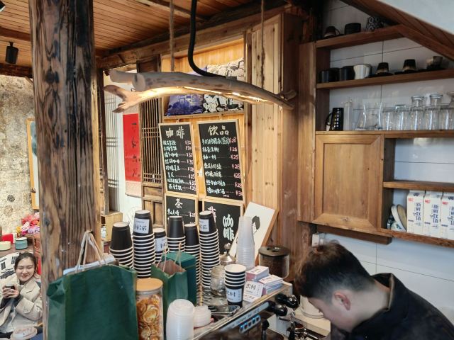宏村景区内,月沼岸边的一家网红咖啡馆,位置极佳,一楼进门有点狭小,一张木炭烤台占据了主要的空间,柜台在楼梯下占了一个角落。从楼梯上去到二楼,还有几个座位,和两个视角极佳的窗口,适合从半高角度拍摄月沼的景色。再往上到三楼,会有更充裕的座位。美式咖啡清爽醇厚,各种风味拿铁美味而有特色。