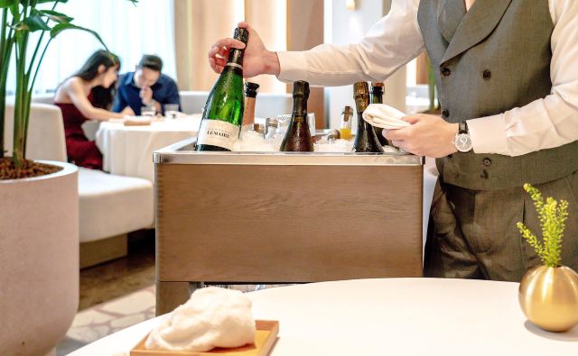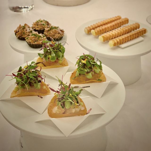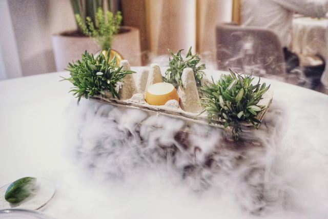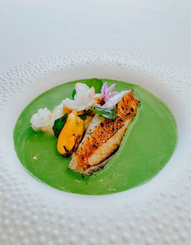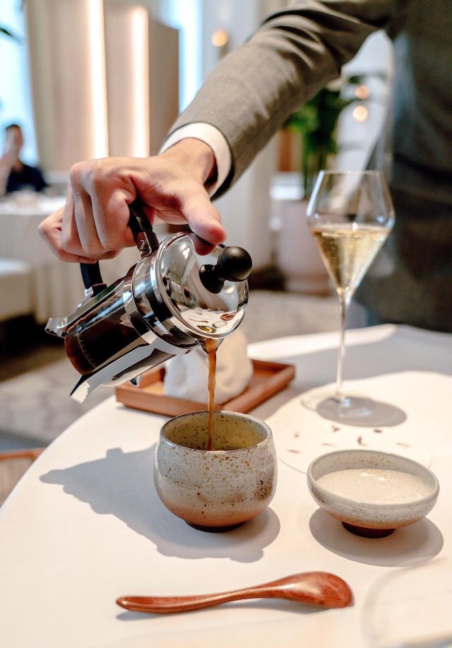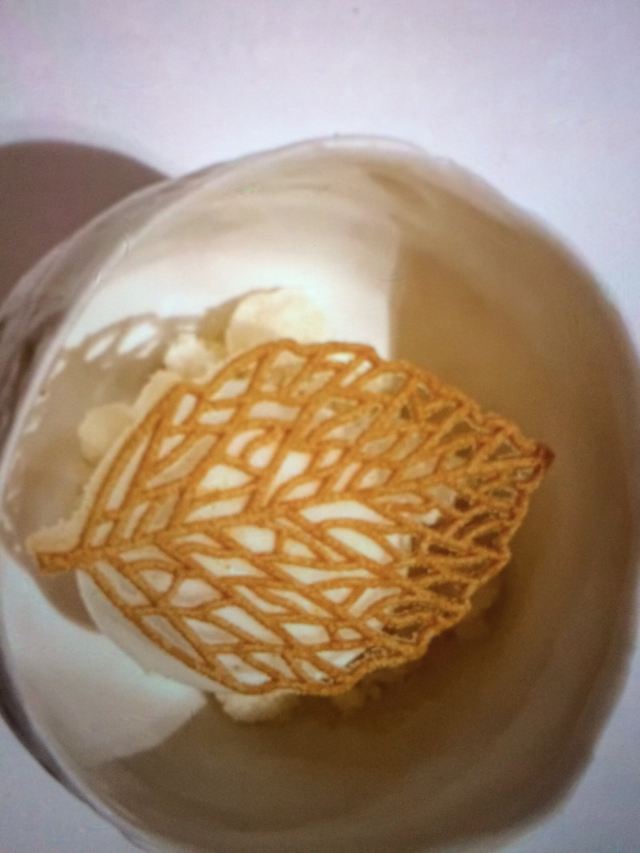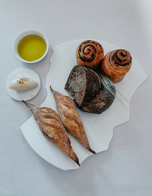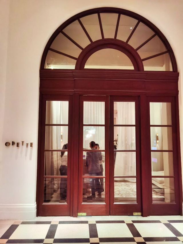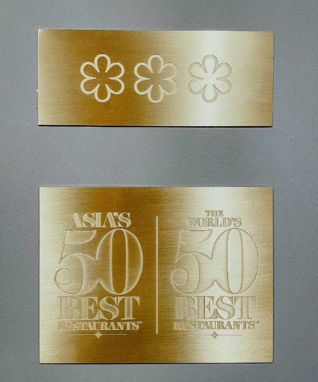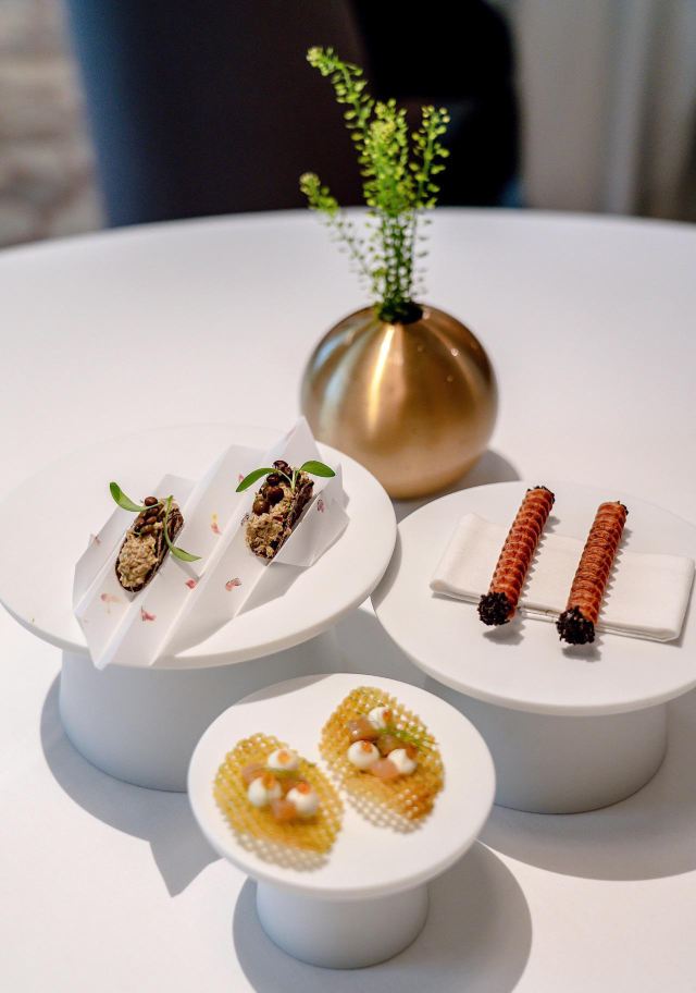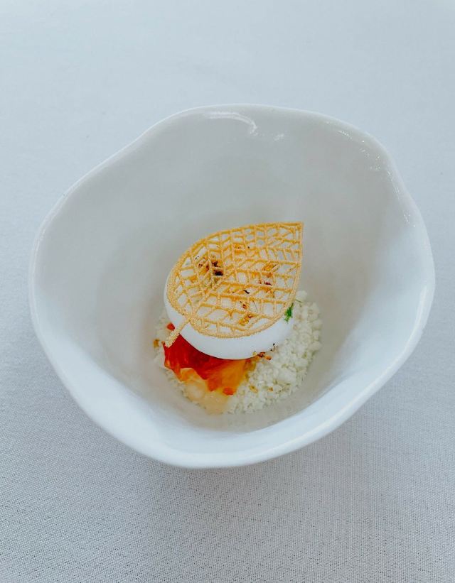 餐厅位于新加坡国家美术馆,室内的色调以莫兰迪浅粉、奶白色和浅灰为主,搭配精致的黄铜灯饰,天花板悬挂的如蝴蝶般的艺术品,整体视觉上给人柔和优雅的感觉,处处都充满着艺术气息。主厨Julien Royer充分尊重法餐的烹饪传统,利用当季食材本身的特性烹制出符合自己烹饪哲学的菜品。