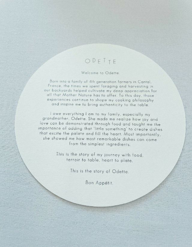 ODETTE新加坡探店 | 米三法餐 Odette 跟朋友一起去排名第一的餐厅吃fine dining。Odette 地点在National Gallery 这样有历史的地方,选址不错,有调性。因为位置有限比较难定,需预付定金,口碑在外,拔高期待。 菜单分成荤食和素食的两种,我们都点了。食材的选择与结合有讲究,但不论荤素,真正惊艳到我的不多。 图片顺序就是上菜顺序。 开胃菜和餐前蘑菇茶味道不错。 第一道前菜,鱼子酱用的是浙江永康的,海胆用的是北海道的。相反,素食的第一道牛油果很清新,能吃出森林的味道。第一道素食赢。 第二道沙巴鱼,鱼肉本身很腥,与甜菜一起吃才能中和腥味,个人对这道菜欣赏不来。素食的第二道是甜菜,摆盘好看,能吃出大地的味道。第二道素食赢。 第三道温泉蛋,摆盘好看用了干冰,鸡蛋说是在 63.5°C 的水中煮了 50 分钟才有这样的效果,软软糯糯。 第四道是苏格兰的蓝龙虾,虾肉不是完全煮透的,控制得刚刚好,肉质Q弹,亮点是酱料用了日本清酒为底,实为少见。 第五道用的是日本最贵的 Kinki 鱼,近畿鱼,酱料是鲜虾煮出来的。如果去北海道,一定要吃这种鱼。这种鱼肉含油脂,但相对银鳕鱼是少的。 第六道主食是胡椒烤鸽,用的柬埔寨贡布的胡椒,烤法国 Bretagne 的鸽子,要了 5 分熟。JR 主厨很有心地在鸽腿上飞鸽传书。 整体来讲,创新不够,还是 traditional french old school 的东西,就来打个卡吧~