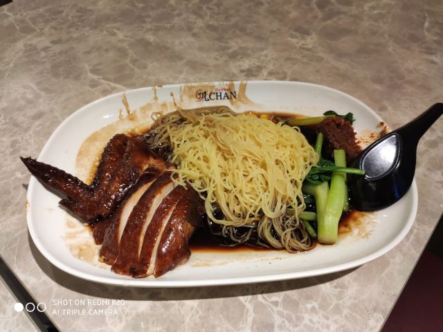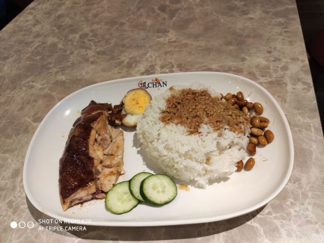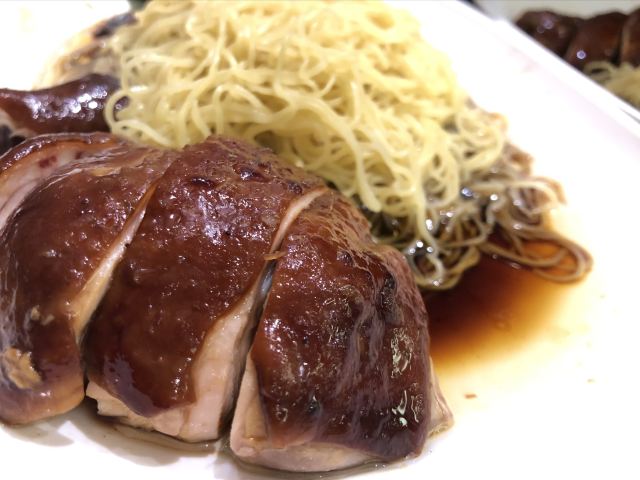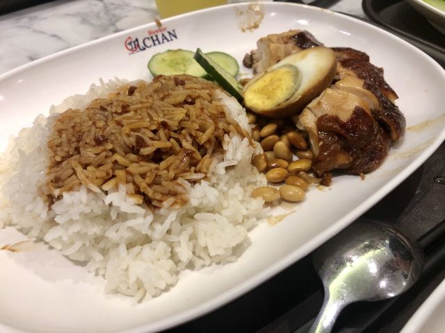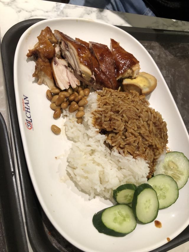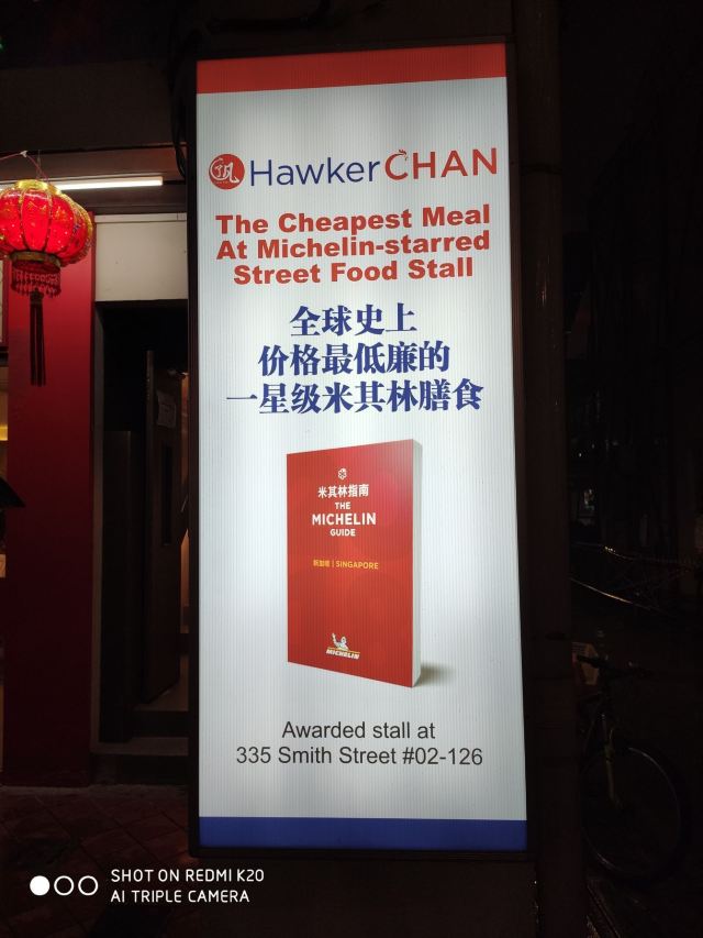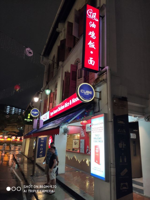 几丁不二没去新加坡以前,在网上了解到新加坡有很多米其林星级美食,因此,对新加坡之行充满了期待。那天冒着大雨,跑到牛车水,去找寻米其林星级美食,那天试了两家,一家是米其林星级推荐的松发肉骨茶,一家是号称最便宜的米其林一星餐厅~了凡油鸡饭。这家店其实就是一个快餐连锁店,从里面格局看,广东香港的游客应该都有非常熟悉的感觉——类似烧腊店或者茶餐厅。当然,这里是以油鸡为主,在广州俗称豉油鸡。从鸡肉的味道来讲,酱油味调的不错,鸡肉也比较新鲜,但鸡肉肉质不怎么样,用广州话来讲,可能是太削了,广州人可能会觉得这不是走地鸡。从个人的体验来讲,估计最具特色的,就是淋在油鸡上的酱油青,类似广州所说的甜酱油,但非常浓稠,味道相当不错。后来在新加坡几天,发现这酱油青都算是新加坡日常菜的一个灵魂了,随处可见,但每家店似乎都有自己所谓的秘方,大体上味道虽一样,但有千差万别的细微差别,似乎这话很矛盾,但这确实是新加坡的一个现实,好像只要有用酱油青的店,都有独家秘制的酱油青出售。这了凡油鸡饭,很类似广州烧腊店卖的鼓油鸡盒饭或碟头饭,个人感觉并无特别突出之处,只能说米其林是一颗洋人的胃。