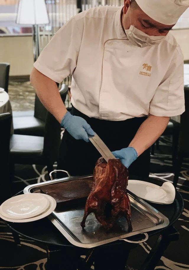 Imperial Treasure Fine Chinese Cuisine餐厅装潢非常大气,用餐环境很舒适,主打高端精品的粤式料理及点心。这一次主要是来尝尝他家的【北京烤鸭】,整只烤鸭烤制的红润有光泽,会有厨师现场片鸭,鸭皮香脆,可以蘸白糖直接吃,鸭肉的部分滑嫩又不失嚼劲,裹上面皮放上大葱丝,味道很不错,就是面皮稍微硬了一些,不够精致。 其他的菜品水准品质还不错,几道粤式点心和白粥搭配起来也是比较美味,对粤菜感兴趣的小伙伴可以来试一试。