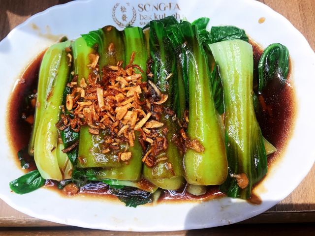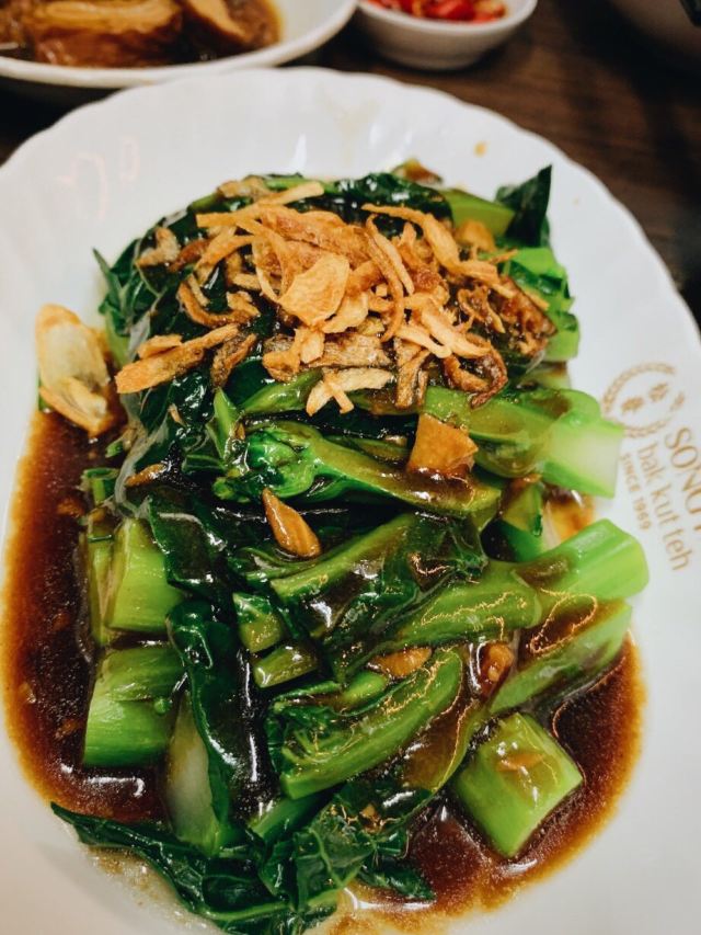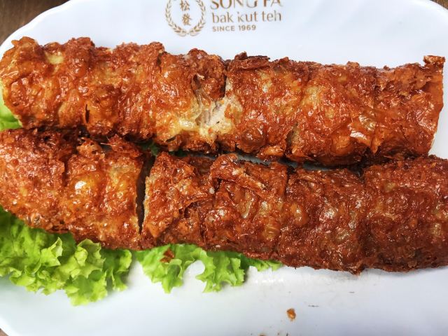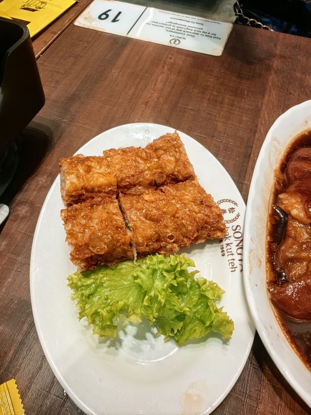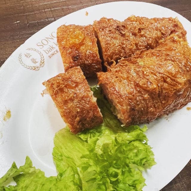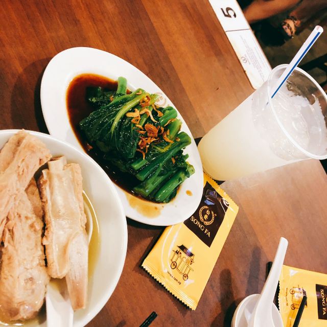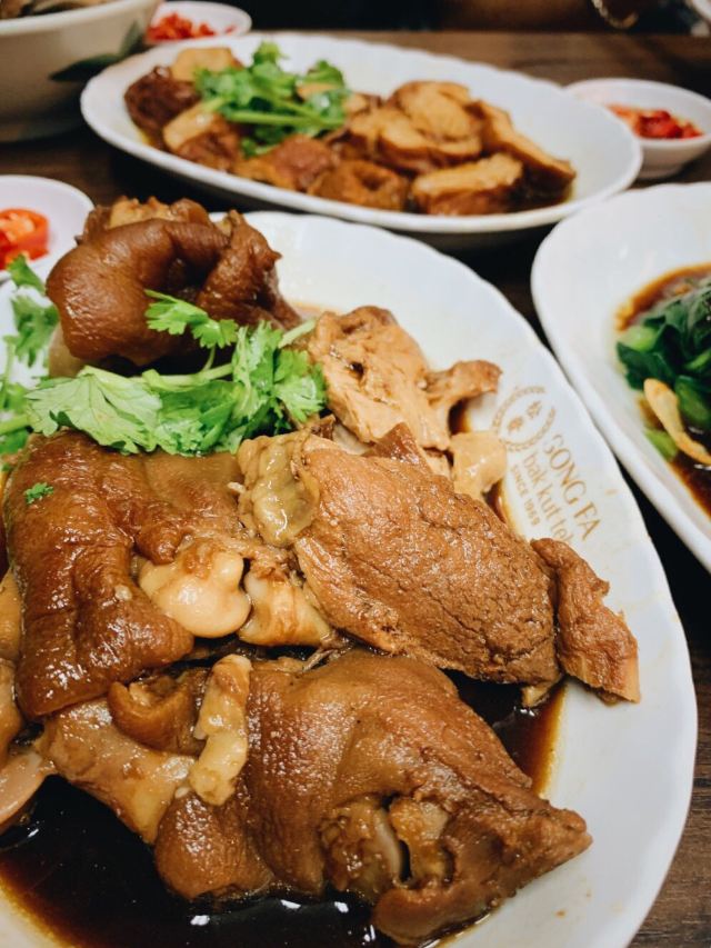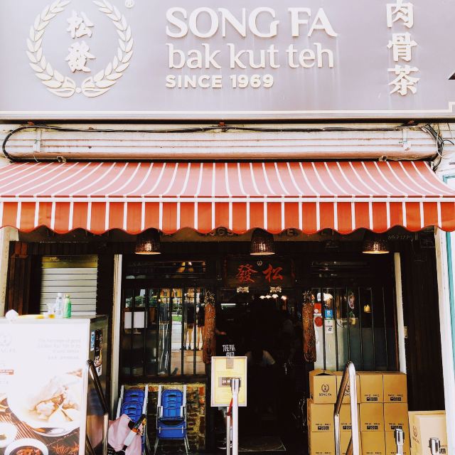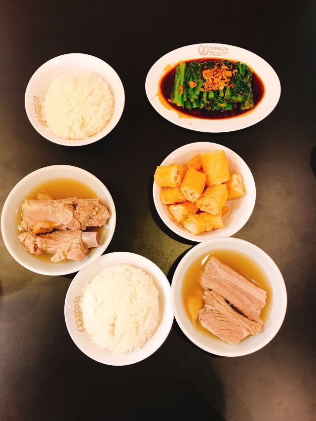 Agatha81松发肉骨茶果然是老字号,下午两点了居然门口还在排队。我们人又比较多等大桌子等了半个多小时,心和胃一起好累。不过吃上的时候大家一致认为很值得!店里可以刷信用卡和支付宝。高汤炖排骨,汤鲜肉嫩、鲜香可口、回味无穷。特别是高汤精排,一份13.9新元且每天限量,我们到的时候只剩一份了。不过普通款也很惊艳,一份9.9新元。与大排档的肉骨茶套餐不同,松发家的卤味、油条、小菜、米饭都是要额外单点的,且最后要收10[%]服务费和7[%]税金[捂脸]。 新加坡蔬菜和肉差不多一个价格,据说全进口有机蔬菜,一个中份青菜6.9新元五香肉卷是油炸豆皮裹猪肉和虾仁,醇香浓郁,却又不油腻;叉烧味道到位,肥而不腻、瘦而不柴;卤味拼盘是肉骨茶的标配,豆腐很好吃不过同行一位吃货最爱的是肉骨茶的高汤,很像猪肚胡椒汤的感觉。汤是免费无限量提供,吃货吃完后一口气喝了五碗汤。