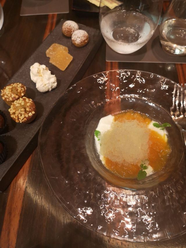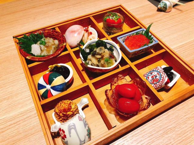 腌虾配海胆及鱼子酱,香煎鲍鱼配意大利烩饭,新加坡本地烤鳟鱼,黑松露煎嫩河鱼,Moroccan Prawn,白松露面,澳洲和牛配芥末、柚子酱,塔斯玛尼亚生蚝,昆士兰海蟹,海鳟鱼刺身,茄子鱼片刺身,近江和牛炸肉排汉堡配炸薯条,WG 和牛燒肉丼,麝香甜瓜鸡尾酒,蓝莓香波鸡尾酒,炙烤金枪鱼,阿拉斯加帝皇蟹,和牛寿喜烧