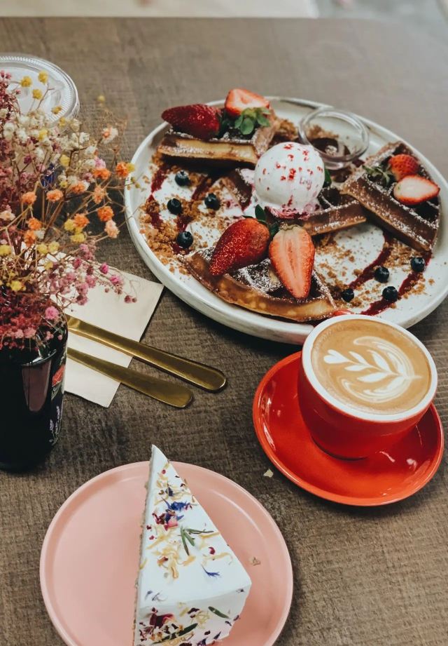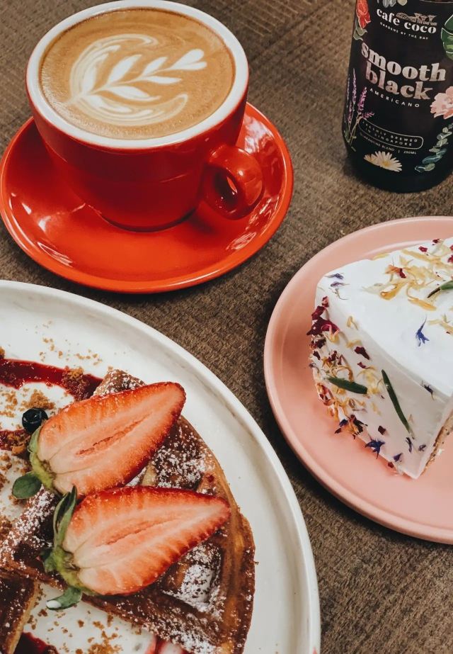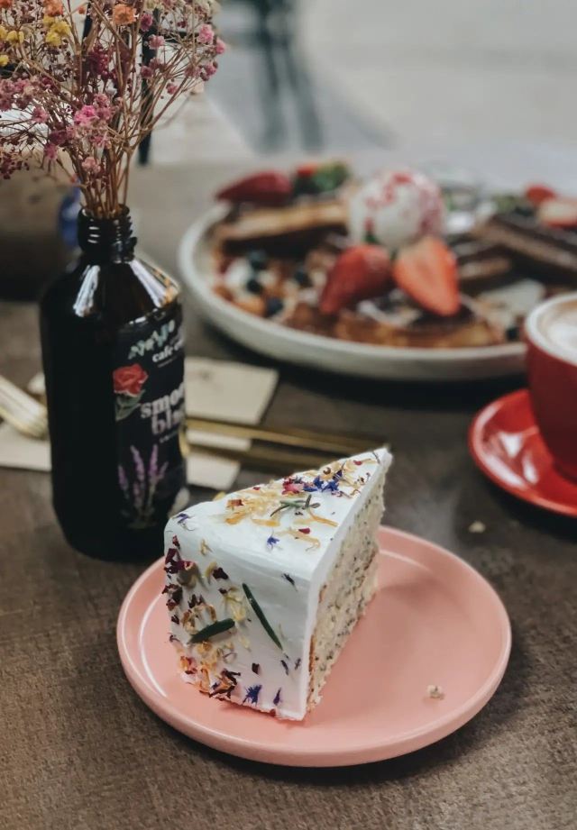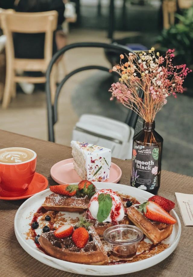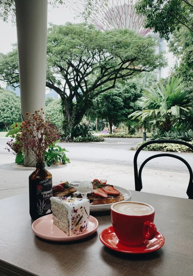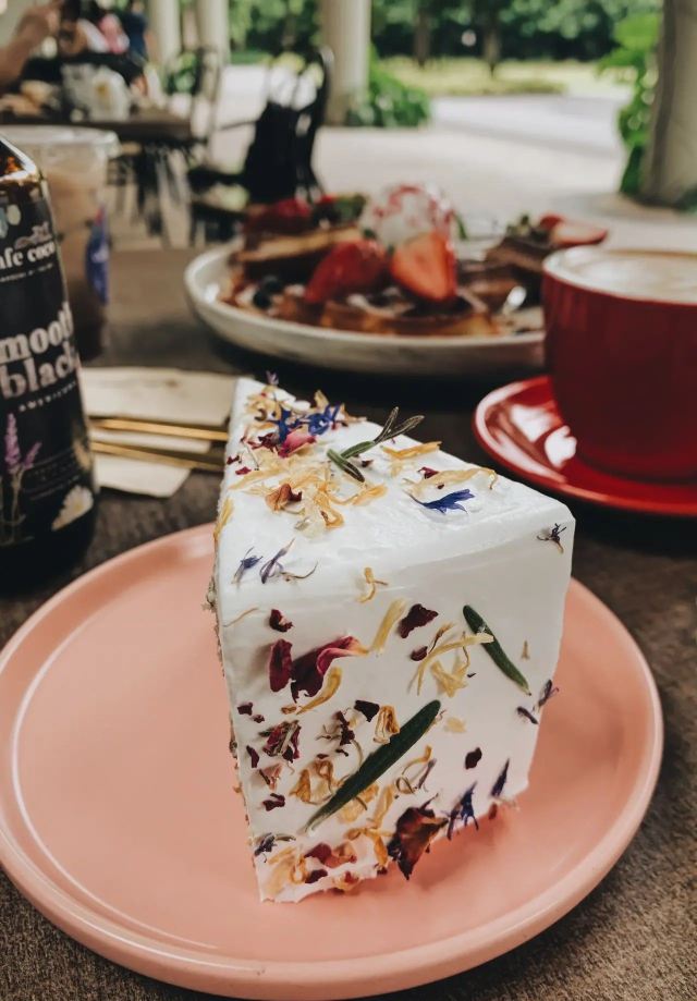 轻轻的一个蚊【Café Coco】,这间咖啡馆开在食阁外面,因为开放式的空间,这里也成许多遛狗人士遛完狗狗歇脚的地方,一到周末就可以看到各种大型犬小型犬聚集,相当可爱又温馨。咖啡馆正对着滨海花园的擎天树,四周布满的绿植也让环境更加舒适。 经典的【Fresh Berries Waffles】颜值相当高,华夫饼配上新鲜的草莓和蓝莓,中间还立着一粒冰淇凌,好吃又好拍。 【Raspberry Lychee Rose Cake】同样是很上镜的一款蛋糕,三层的蛋糕烘烤的蓬松松软,中间夹心是山莓果奶油,外面一层的奶油甜而不腻,最后用各种色彩丰富的花瓣点缀,颜值实在是不要太高,每一口还能尝到淡淡的花香,真的是必点。 他家还有限定的【French Lavender Brunch Set】和几款特定薰衣草饮品如【French Lavender Latte】【Earl Grey Lavender】都需要提前在网上预订哦。