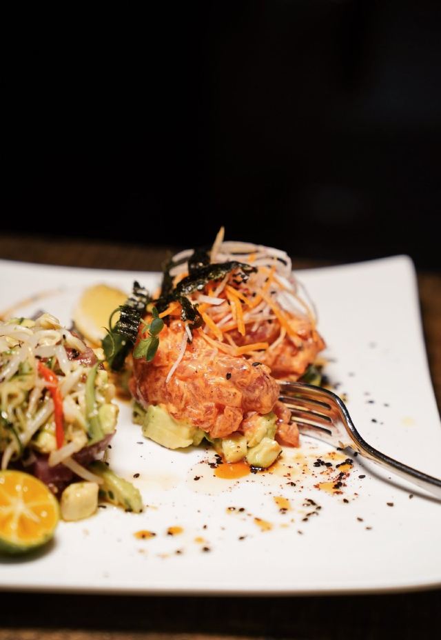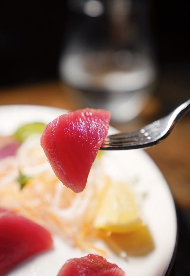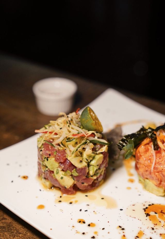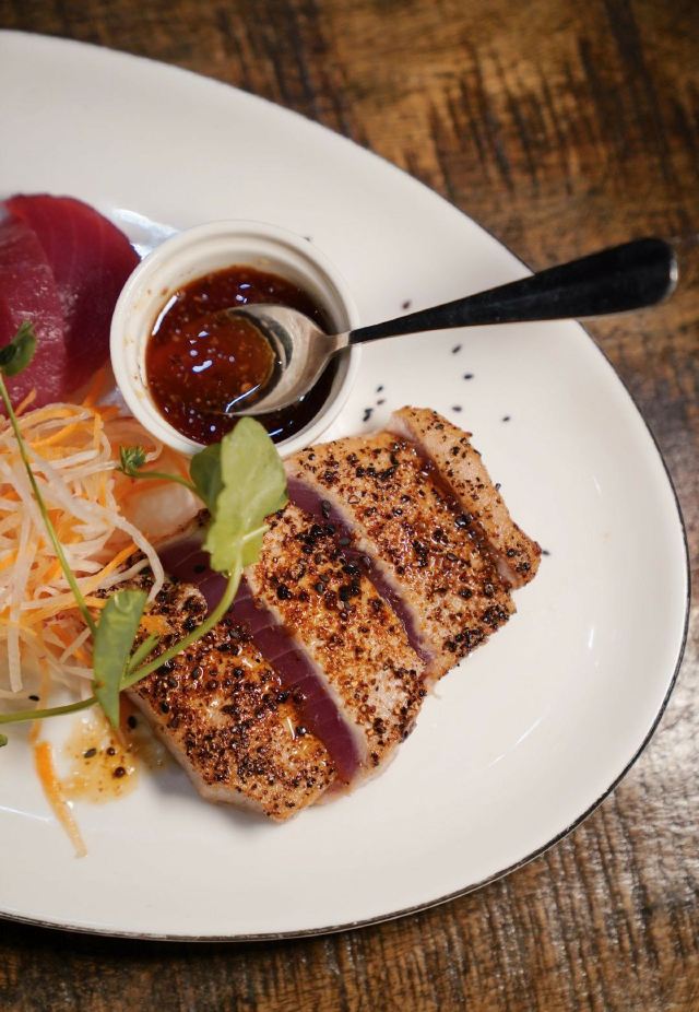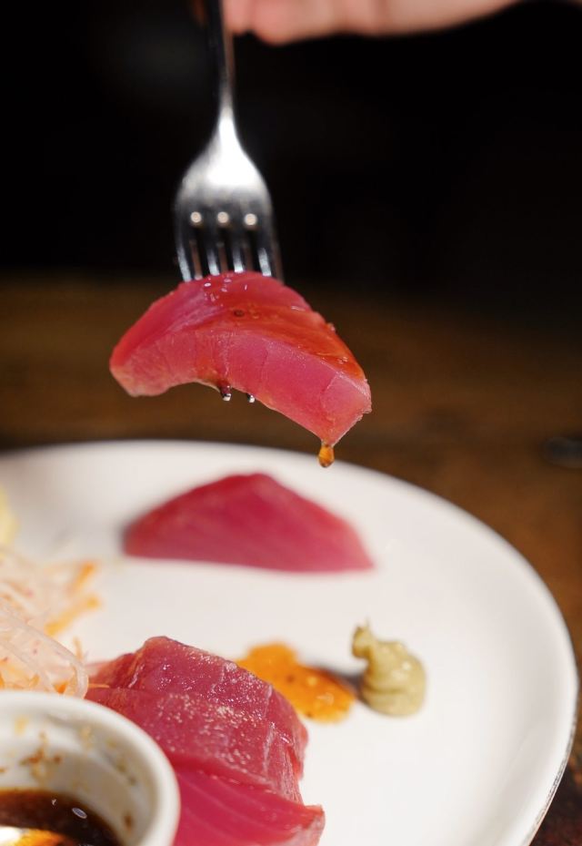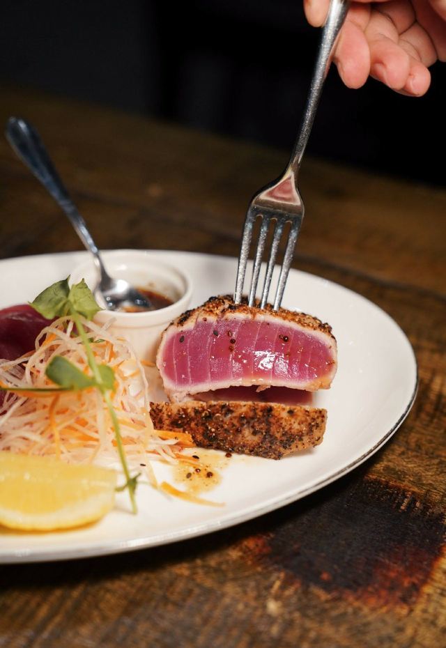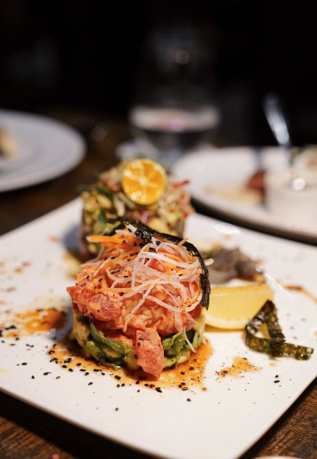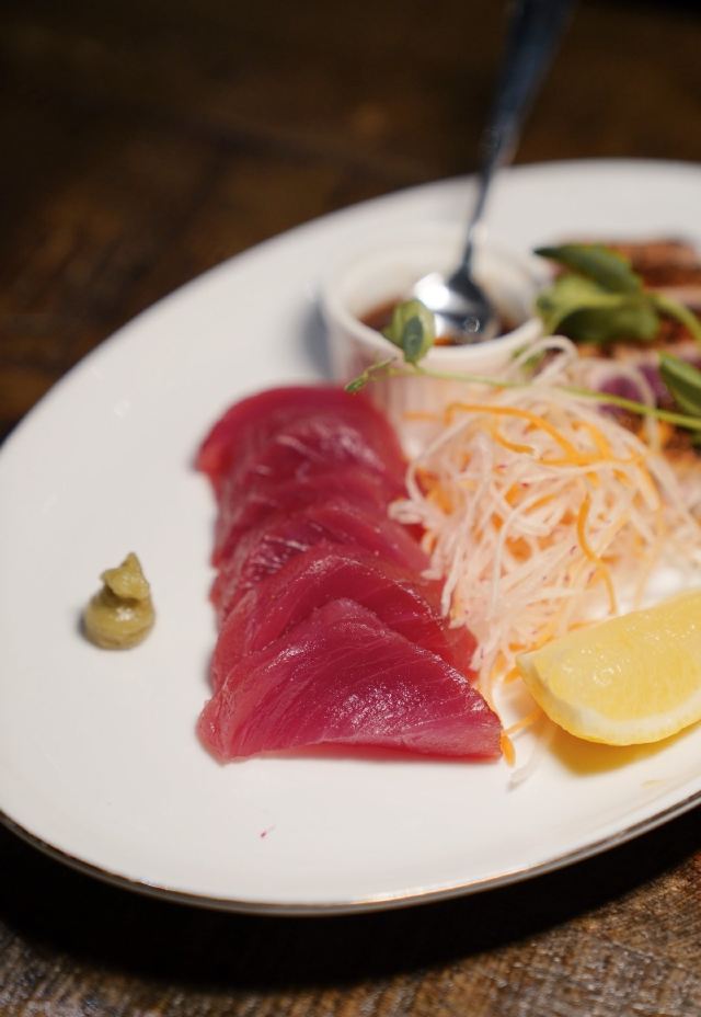 轻轻的一个蚊sᴀsʜɪᴍɪ sᴏʏ, ᴡᴀsᴀʙɪ, ʀᴀᴅɪsʜ 第一道肯定要从刺身吃起,红中带粉,微微透亮,纹理清晰又紧致。入口无比滑嫩,没有一丝筋拉,又能感受到极致的丰腴。因为足够新鲜,酸得柔和清新,余味甚至甘甜,完全不会腻啊! ᴛᴀʀᴛᴀʀ sᴇsᴀᴍᴇ, sᴏʏ, ᴄᴏᴄᴏ, ᴋᴀʟᴀᴍᴀɴsɪ 金枪鱼塔塔拌上牛油果,油脂更加饱满,口感更上一层的软滑。酱油和芝麻简单调味,顶上脆嫩的豆芽和黄瓜沙拉,搭配小酸柑,鲜味也提升了。 sᴘɪᴄʏ ᴛᴜɴᴀ sᴇᴀᴡᴇᴇᴅ, sᴇsᴀᴍᴇ 辣得更加开胃,但不刺激,是有蛋黄酱的奶香平衡的 紫菜和芝麻增加香气,有种韩式拌饭的风格,也是好吃! ᴛᴜɴᴀ ᴡᴇʟʟɪɴɢᴛᴏɴ sᴇᴀᴡᴇᴇᴅ, sʜɪᴛᴀᴋᴇ & ʙᴀʙʏ sᴘɪɴᴀᴄʜ, ᴍɪsᴏ ʙʀᴜʀʀᴇ ʙʟᴀɴᴄ 金枪鱼惠灵顿。 (反正我觉得比他家经典款牛肉惠灵顿好吃太多了)因为紫菜和菠菜裹住里面的鱼肉,让外面的酥皮始终保持油酥酥的状态,一点都不会湿软,口感对比是对的!鱼肉上桌时候外熟內生,要赶紧吃,不然里面会被余温加热。 菠菜蘑菇是个抢戏的配角,吸收了金枪鱼的鲜美,再用味噌白黄油汁调味,变得软甜多汁,又特别立体 舔盘之爱。