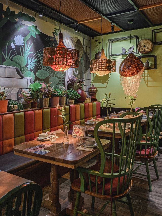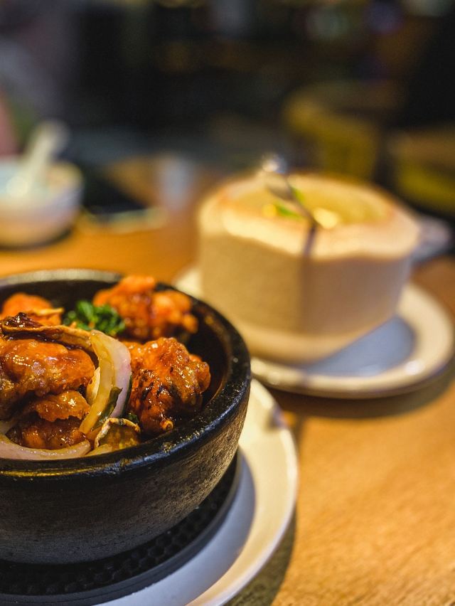 ☘️环境: 浓浓的东南亚风情,环境没得说,喝水的杯子尤其好看,还有师傅在外面直接做飞饼,就是太撑了要不然也想试试饼; 「咖喱皇炒大虾」咖喱好好吃啊,好想就着米饭一起吃,虾🦐很大又新鲜; 「三杯鸡」看好多人都点也试试果然不踩雷,一点也不腻,量也很多; 「菠萝炒饭」料很丰盛,也有虾仁 腰果 腊肠还有叫不出名的东西;看好多人都点这个; 「椰子奶冻」不喜欢喝椰子的我却爱上了椰奶冻,一丝丝甜冰凉凉,芒果➕薄荷,颜值也是极高了; 两个人点了四个菜根本也吃不完,我看其他桌的基本也都吃不完最后都会打包。 下次去想试试粉丝煲,看着感觉好吃😋