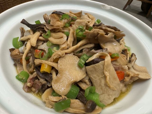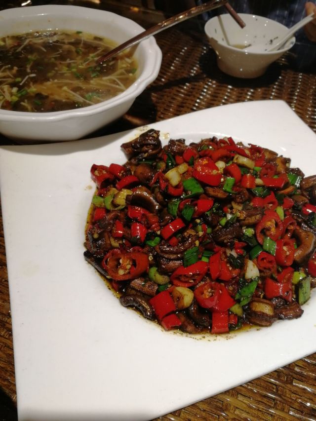 上饶本地司机推荐的本地人热衷的江西菜馆子,上饶风味集中地。当地风情的建筑,很吸引人的眼球,安排好座位后,到门口一间大屋子里看菜下单。菜色一半以上是火红爆辣的,必须要补一个萝卜汤来中和一下。最重要的感受是,上饶的菜量大得出奇,一份炒粉上来,一个人连四分之一都消灭不了,完败。