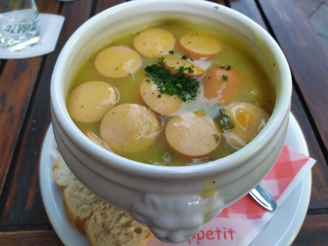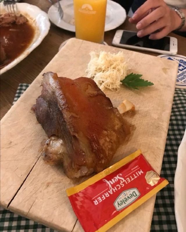 当地一家有名的酒屋,多是根据传统在中午12点前吃白香肠的当地人。啤酒有9款可选,其中TAP3是无酒精的,推荐给不善饮酒的人士。喝着清冽的啤酒,配上份量十足的烤猪胸肉,巴伐利亚煎土豆,和开胃的酸菜,实在令人满意。