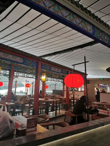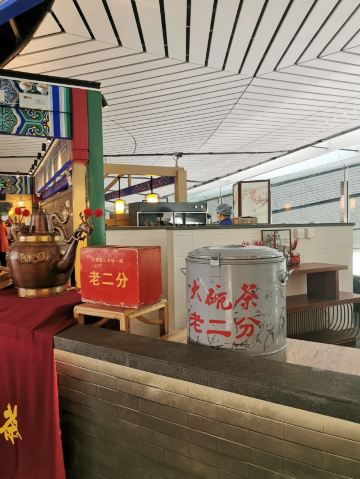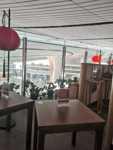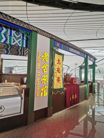 老舍茶馆在大兴机场开设的店面位于机场候机楼的五层东区,面积较大,其建筑装饰很有老北京的风格。这里空间很宽敞,布置得很简洁明亮,座位很舒适,坐在这里能够看到楼下安检区后面的风景,很漂亮。特别有意思的是,这里还摆出了前门大碗茶的茶桶和招牌,很容易让人怀旧。由于这里刚开始营业,消费的客人不多,基本上都是来大兴机场游览的人路过。