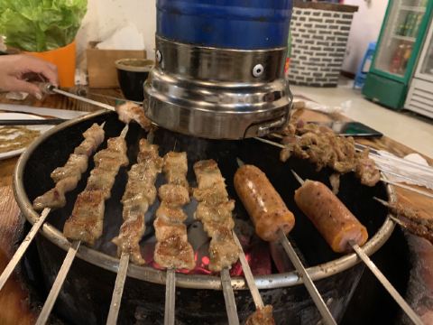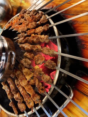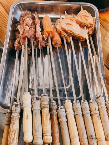秘制鸡翅,五花肉,甜酥面包片,纯肉烤肠,牛肉,橙汁,锡纸千页豆腐,生菜,羊肉串,花生水煮毛豆拼盘