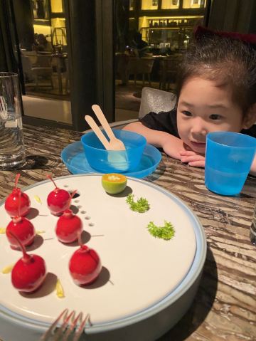 晚餐非常好服务很用心,每道菜都很精致,作为柏悦酒店餐厅入住一定要来体验下,生日去的还送了碗很大的面,特别推荐M6的牛排非常好孩子很喜欢