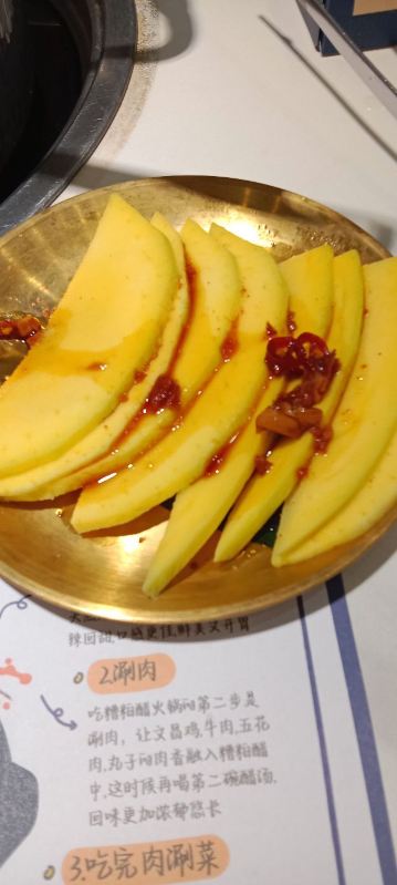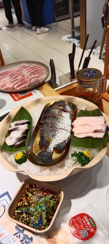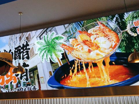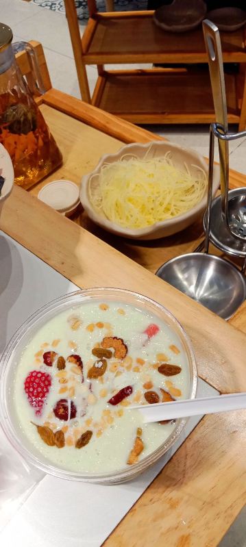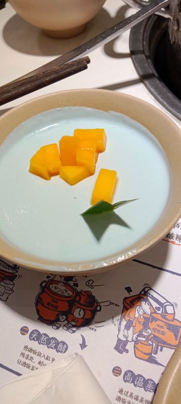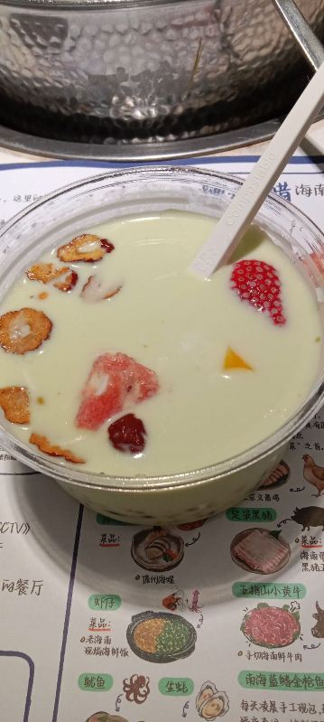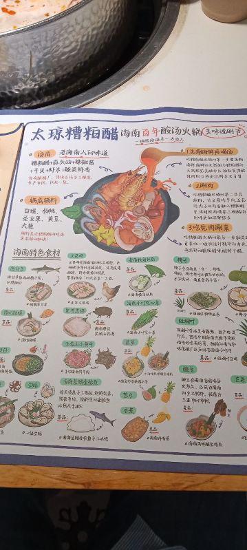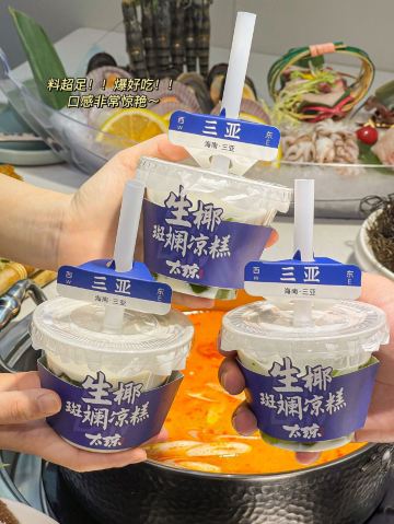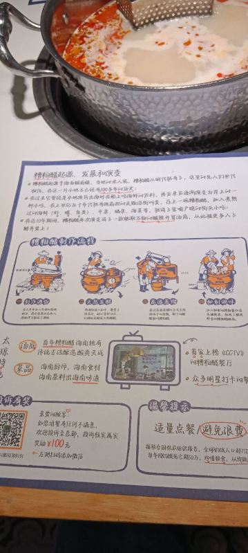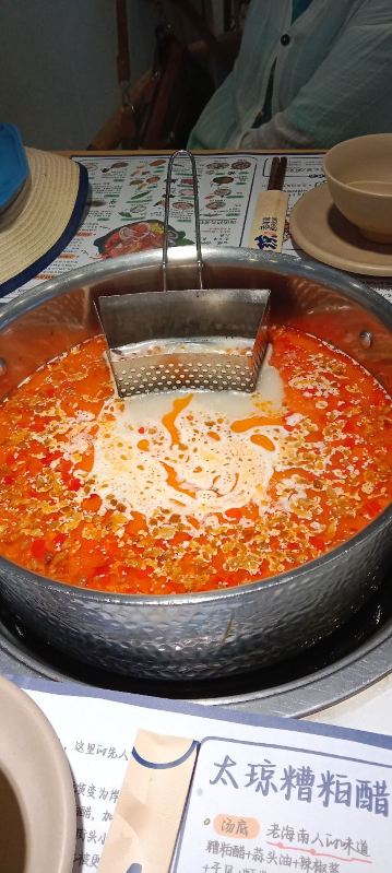 TAI QIONG LAO HAI NAN SUAN TANG HUO GUO看了很多网友的推荐,特意慕名而去的太琼糟粕醋,全部都是直营店,也不用担心价格离谱,放心消费就是了。 选择了离酒店最近的百花谷商业街分店,跟着导航走,一路抵抗住了沿路的诸多拉客叫卖的诱惑,再爬个二楼,终于找目的地了。 很小清新的南亚热带风格装修,店堂不是很大,却干净整洁,服务生都有带着口罩,手脚很麻利。 点了套餐,除了几小条不认识的海鱼,就是半只文昌鸡,两小盘丝瓜和土豆丝了。还有一个打卡收藏送斑斓凉糕的活动。可以参与一下。 实话实说,糟粕醋的汤汁还是很不错的,酸辣开胃。那些海鱼鸡肉倒是普普通通,尤其是文昌鸡,盛名之下其实难副。 套餐里的椰丝裸分店没有备货,直接想换成米饭或拉面 …讲真,来三亚不吃特色吃白米饭?貌似有点搞笑吧~沟通良久,又换了一份斑斓凉糕 😂然后单点了一锅现焗海鲜饭,只有4人大份,没有2人的小份…也只能硬着头皮点了…味道嘛,很类似于福建湿软的咸饭 ,不是广东干香煲仔饭的类型,个人感觉无功无过吧。 想试试三亚特色的亲,可以考虑拔草哦~