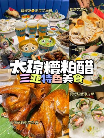 sy75看了很多网友的推荐,特意慕名而去的太琼糟粕醋,全部都是直营店,也不用担心价格离谱,放心消费就是了。 选择了离酒店最近的百花谷商业街分店,跟着导航走,一路抵抗住了沿路的诸多拉客叫卖的诱惑,再爬个二楼,终于找目的地了。 很小清新的南亚热带风格装修,店堂不是很大,却干净整洁,服务生都有带着口罩,手脚很麻利。 点了套餐,除了几小条不认识的海鱼,就是半只文昌鸡,两小盘丝瓜和土豆丝了。还有一个打卡收藏送斑斓凉糕的活动。可以参与一下。 实话实说,糟粕醋的汤汁还是很不错的,酸辣开胃。那些海鱼鸡肉倒是普普通通,尤其是文昌鸡,盛名之下其实难副。 套餐里的椰丝裸分店没有备货,直接想换成米饭或拉面 …讲真,来三亚不吃特色吃白米饭?貌似有点搞笑吧~沟通良久,又换了一份斑斓凉糕 😂然后单点了一锅现焗海鲜饭,只有4人大份,没有2人的小份…也只能硬着头皮点了…味道嘛,很类似于福建湿软的咸饭 ,不是广东干香煲仔饭的类型,个人感觉无功无过吧。 想试试三亚特色的亲,可以考虑拔草哦~