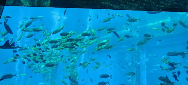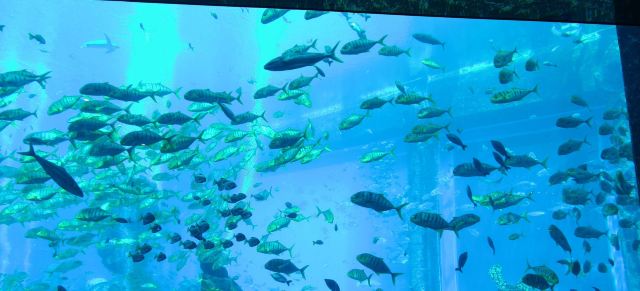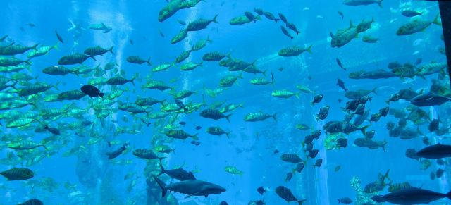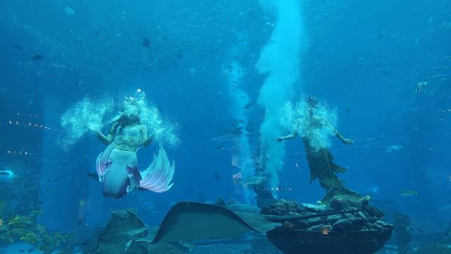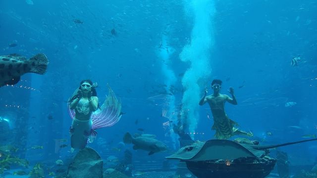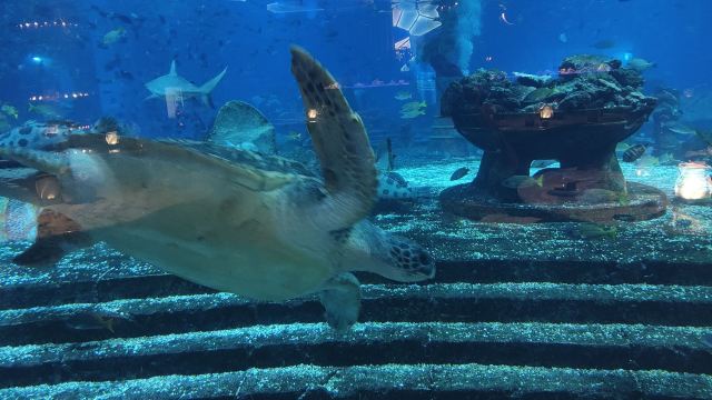 三亚亚特兰蒂斯酒店内的网红海底餐厅,可通过巨大的落地窗欣赏到大使环礁湖的壮观美景。在用餐的同时,有无数的海洋生物在餐桌旁游来游去,整个餐厅笼罩在蓝色的海洋下,美轮美奂,仿佛来到了梦幻王国。