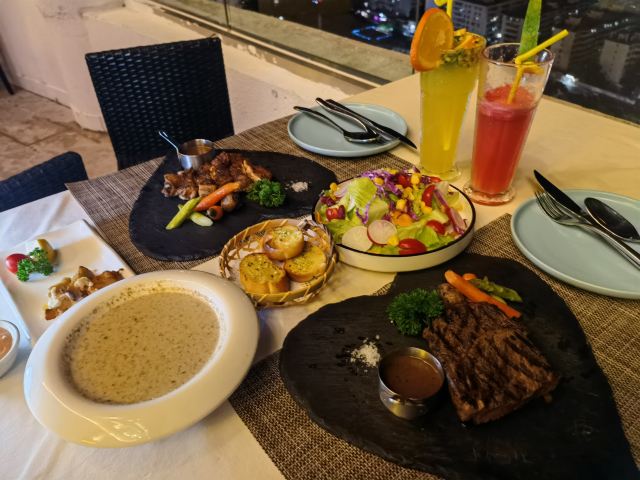 过来吃的晚餐,没有团套餐,单点的牛排套餐,有点小贵。环境不错,服务也挺好。食材新鲜,菜品味道一般,甜点不错,推荐下午茶。总的来说这里适合拍照打卡,下午茶时间段过来拍照很美。晚上夜景一般。美食就算了,美景多。