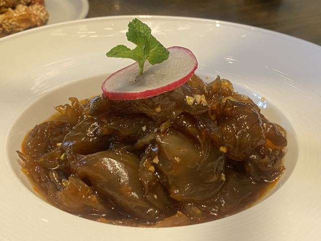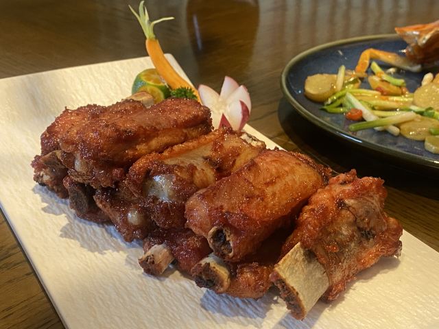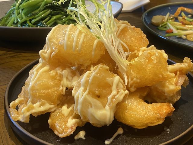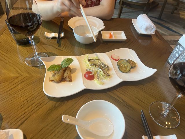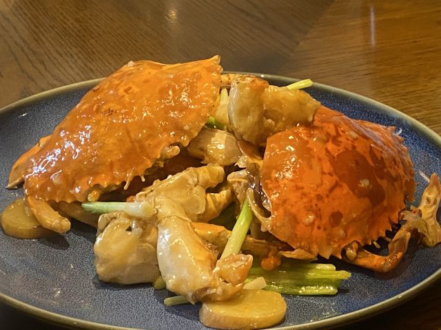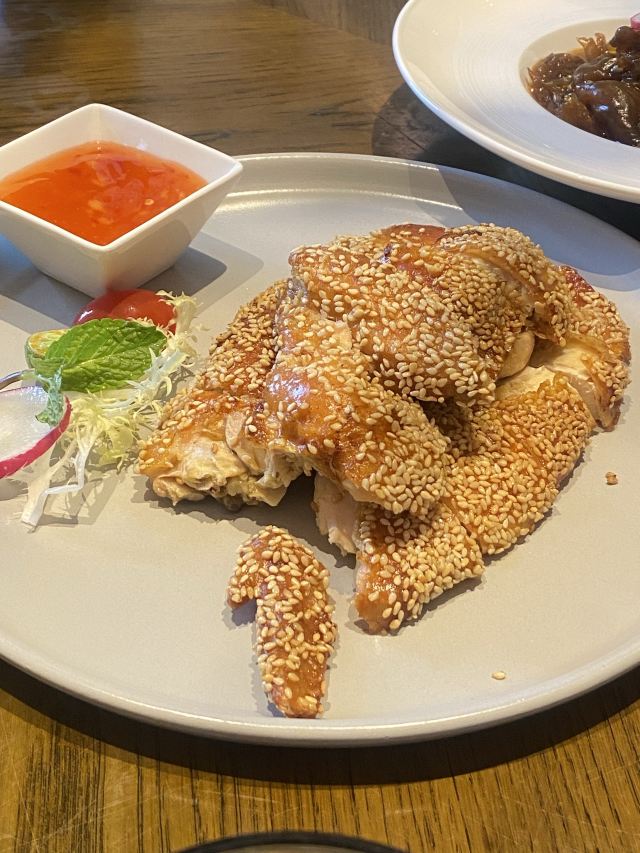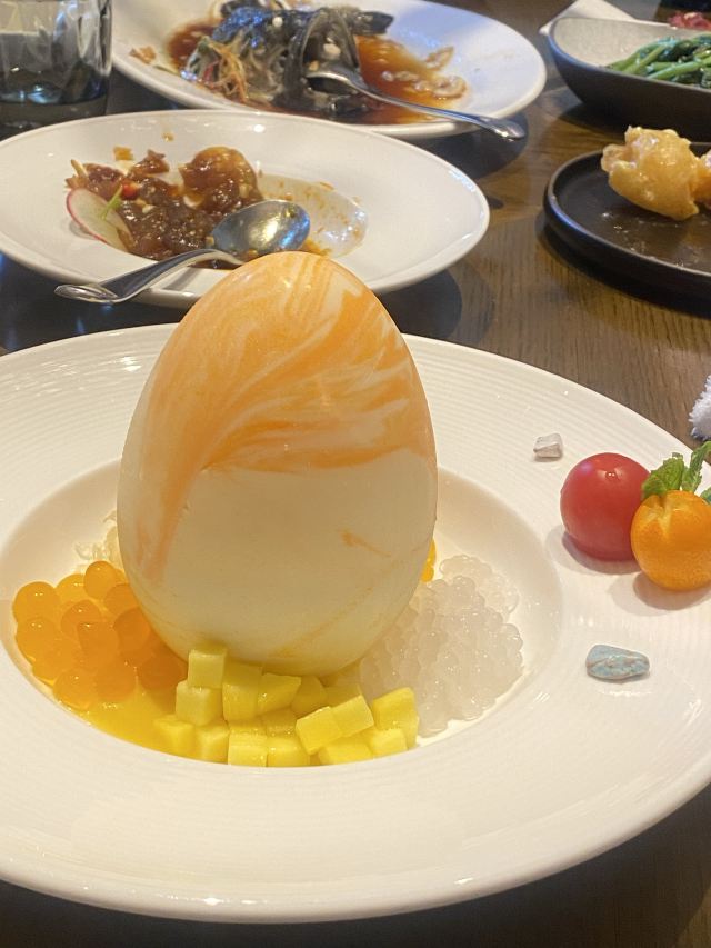 Dada姊妹今天终于有时间和朋友一起来吃饭🍚早就听朋友说这里菜品口味不错,今天一尝,味道好极了👏 环境: 首先进门吊灯鸟笼的造型很独特,餐厅整体很宽敞,位置坐的也很舒服😌 古铜芝麻文昌鸡 菜单上的招牌菜,果真不错外皮酥脆,炸的刚好,里面鸡肉口感嚼着也刚好,配上甜辣酱一起吃,整体吃起来口感很好 凉拌海蜇头 出去吃饭最喜欢点的凉菜,这里做的味道微微辣,海蜇爽脆开胃🤤 黑松露石窝烧自制黑豆腐 这也是推荐菜,据说黑豆腐是手工制作,入口很嫩,还有淡淡的黑松露香味,很下饭 蒜蓉蒸鲍鱼 鲍鱼个头很大,配上面上的蒜蓉,入口有嚼头 姜葱炒和乐蟹 海南的四大名菜之一,姜葱炒的很入味,蟹🦀️也很新鲜 山葵酱焗青虾球 个头很大一颗,平常在外面都没吃过这么大颗的,面上挤的芥末酱,外皮很脆,里面虾肉还去了虾线,口感饱满 藤桥排骨 油炸的排骨,和其他地方吃的不一样,口感微微甜味,炸的很香,也很好吃😋 清蒸深海石斑鱼 鲜活的海鲜吃起来口感还是和冰鲜的有很大差别,鱼肉肉质紧实、鲜嫩,很新鲜 杨枝甘露 造型是个蛋🥚的形状,蛋壳上的图案很有艺术感,吃之前服务人员说要敲碎了吃,仪式感满满的这道甜品很常见,但是做的好吃的并不多,这里做的味道就很不错浓稠合适、甜度合适、用料丰富,很不错 整体体验下来很不错、整体性价比也很高不论是菜品的口味还是餐厅的服务都很好,下次有朋友来海棠湾必须推荐来这家餐厅!
