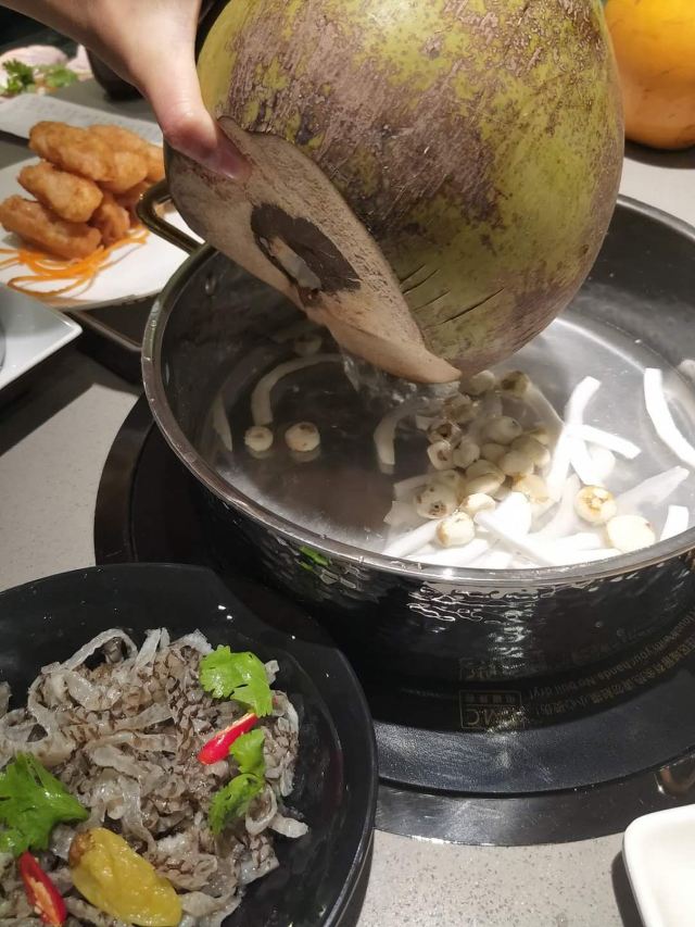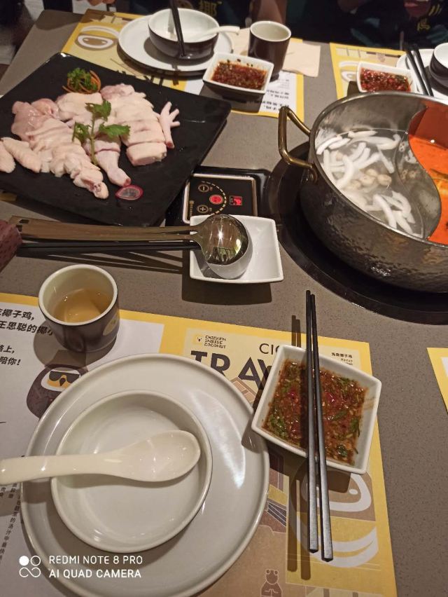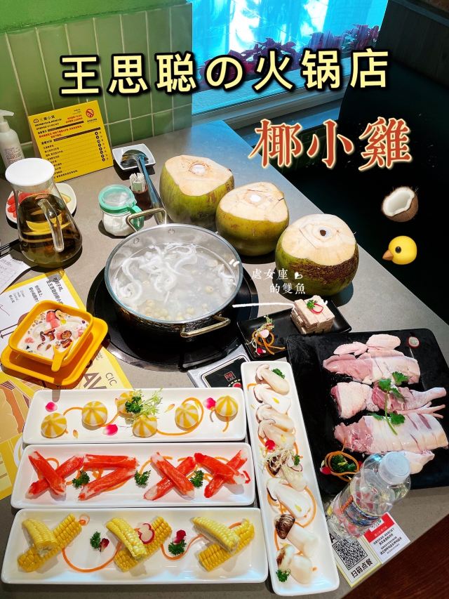 处女座的双鱼🔊明星开火锅店已经司空见惯了,这家@椰小鸡椰子鸡大东海银泰店就是著名的王校长王思聪开的店,粉丝经济还是很厉害的,我也不能免俗🤪! 📍位置:大东海银泰阳光度假酒店一层 [薄荷]环境:宽敞明亮,桌面足够大,沙发🛋️座椅舒适,用餐体验感很不错,很多小鸡🐤的装饰也可爱,整体布置很温馨! 🥥「原味椰子鸡」:三个大青椰倒进锅里就是锅底,跟你你的喜好选择加不加矿泉水就行,开锅后放入「散养120天走地文昌鸡」,服务员💁小鸡🐤闹钟⏰定时,待叮玲玲一响就可以开吃了[调皮]!鸡肉肉质紧实口感鲜嫩,汤底鲜美,蘸料店员会询问你的喜好后帮忙调配,nice! 🥢吃完鸡肉后,开火继续涮菜,「芋头条」、「松茸菌」🍄、「加拿大雪蟹柳」、「蟹籽包」、「玉米条」🌽都是不错的选择,性价比美丽,菜品新鲜,菜量合适,随便点,不踩雷 🥣饭后甜品推荐「椰奶清补凉」,甜甜的椰奶,丰富的配料,吃了太多肉之后,很解腻 🔚至此,ending,椰小鸡作为王校长的品牌椰子鸡火锅连锁店在三亚每个区域基本都有分店,在三亚想吃这个明星同款还是很简单很方便的🤪!