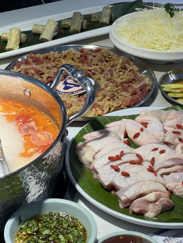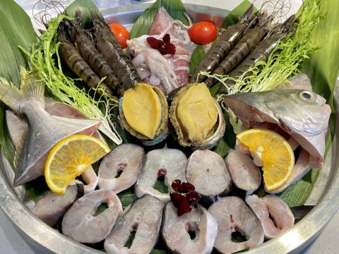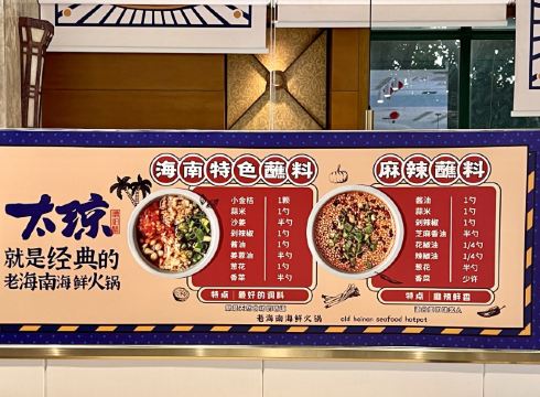 豪华海鲜拼盘,椰子饭,原切雪花肥牛,糟粕醋酸汤海鲜火锅,糟粕醋,发财海发菜,青芥末沙拉生蚝,太琼秘制脆皮乳鸽,老海南韭菜虾仔焗饭,黑猪肉五花肉片,琼式古法盐焗鸡,特色海南粉,海鲜