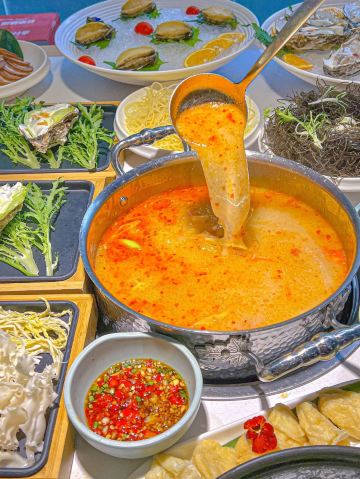 爱斯米路三亚靠口碑火起来的糟粕醋扛把子🔥无敌开胃 没吃过就听过他家的鼎鼎大名了‼️硬是被朋友(他家铁粉)拉着来吃了一次,不吹不黑,味道是真的不错👍跟我在文昌铺前吃过的正宗糟粕醋有的一拼,环境也是渔港老码头的既视感,整体感觉很通透,让人有一种莫名的舒适感👌 - 🏠店名:太琼糟粕醋海鲜火锅 💰人均:125 ⏰时间:11:00-22:00 📍地址:鹿岭路三亚宝宏大酒店2楼 - ✅菜品短评 ⭕️【糟粕醋酸汤海鲜火锅】 尝了第一口糟粕醋的酸汤就被征服了,酸辣爽口,瞬间觉得我能吃下一头牛,无敌开胃!一定要再点一盘海鲜拼盘,有鱼有虾,还有鲍鱼、扇贝、章鱼等种类非常丰富,足够两个人的吃了,下锅经过糟粕醋的洗涮之后一点腥味都没有,反而更加鲜美了,yummy~ · ⭕️【深海和牛:鲜活海甘草】 海鲜尤其首推这个海甘草,是所有海鲜涮菜中最好吃也是最让人惊艳的一个,鱼肉切成方正的薄薄一片,口感细嫩,入口即化 · ⭕️【发财海发菜】 不点不是中国人,糟粕醋的灵魂搭档,没它绝对不行,下锅只需要涮个几秒就行,爽脆可口很➕分 · ⭕️【琼式古法盐焗鸡】 如果人多的话建议可以点一只盐焗🐔,香咸的味道根本停不下来,人少的话可以不用点,因为分量还是蛮大的,可能会吃不完