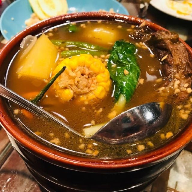 青芒果沙冰,BBQ猪肉串,牛膝骨蔬菜汤,春卷,冬阴功海鲜汤,墨鱼汁面,Adobo Chicken,铁板猪内脏