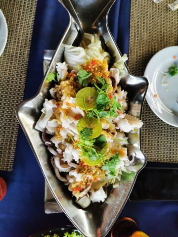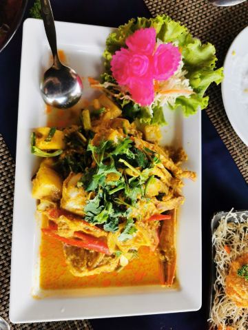 彼岸之澄甲米的第一餐,人均70RMB以内可以吃到这些,物价感人。 柠檬鱼,鱼肉鲜嫩,柠檬和香料调味,酸辣入味,炎热天气里吃蛮开胃的。 炒空心菜,空心菜略有点老,随便吃吃。 冬阴功汤,泰国的冬阴功汤几乎家家都好喝,这家也是如此,酸酸辣辣,香茅的独特香气最爱了。 咖喱蟹,螃蟹不是活蟹,略有点影响口感。但毕竟价格摆在这里,要求不能太多。 菠萝猪肉炒饭,一份炒饭装满了整只菠萝,菠萝的水果香气和猪肉炒饭特别搭调,一份几乎都吃光了。 芒果糯米饭,饭后甜品,芒果real甜,椰浆和糯米饭也喜欢。 绿奶茶,这么热的天气里,来一杯冰爽的奶茶太幸福了。 柠檬茶,泰式柠檬茶的味道,还是更喜欢绿奶茶。 敞开式环境,感受下东南亚的原生态也蛮好的。