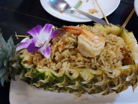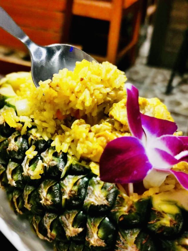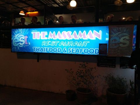 peachsai下午到的甲米,在酒店安顿好行李休整一下后准备出来觅食,看看也差不多晚餐时间。酒店对面很热闹,餐饮美发按摩等基本都有,满足需求,但是也要在这些店中pick一下,第一顿就选在massaman,据说口碑不错,跟很东南亚的餐厅一样,通风的不带空调,不过有个巨大的电扇调节空气。坐在风口下稍微不太热了。点的都是很具泰国特色菜。 空心菜,很嫩,小辣,泰菜的必点。青柠鲈鱼,酸辣爽口,鱼肉很嫩,相比肉喜欢吃鱼多一些。咖喱蟹,海蟹个头不是特别大,不过4个人分分也足够了。咖喱浓度蛮高,加了蛋液一起增加稠厚度;冬阴功汤,国汤必须来一份,偏酸辣一点,里面虾很多,香茅也多。 菠萝海鲜饭,放在半只菠萝中,出品不马虎。最后来个甜品-芒果饭,做法也很传统,芒果很甜。饮料有绿色的泰式奶茶还有冰镇柠檬茶,不错喝。性价比也挺高。服务员还有一位能讲简单中文,所以中文、英文交流都没有障碍,支付宝不能用,现金可以。