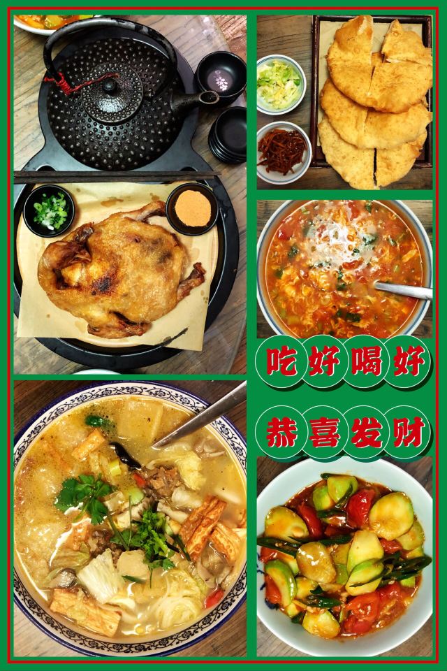 葫蘆雞,八大碗,捣蒜冻肉,洋柿子西葫芦,小炒鲜菌,小炒蓮菜肉片蓋帽,黄酒,四喜丸子,兰花小藕,农家菜盒,卤三样,卤猪耳,卤猪脸,咸菜爱上土鸡蛋,大刀笋片,大蒜烧肚,大豆芽炒粉,家乡小炒粉,葫芦鸡,酿皮子,馒头,小酥肉,辣子蒜羊血,枣模糊,拔丝红薯,戶县油餅,浆水鱼鱼,茴香拌煎饼