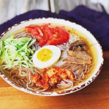 冷面,通常指的是朝鲜冷面,是驰名国内外的一种深受人们喜欢的传统民族食品。其中尤以荞麦面冷面为著称。一般用牛肉汤或鸡汤,佐以辣白菜、肉片、鸡蛋、黄瓜丝、梨条等。食用时,先在碗内放少量凉汤与适量面条,再放入佐料,最后再次浇汤。其面条细质韧,汤汁凉爽,酸辣适口。